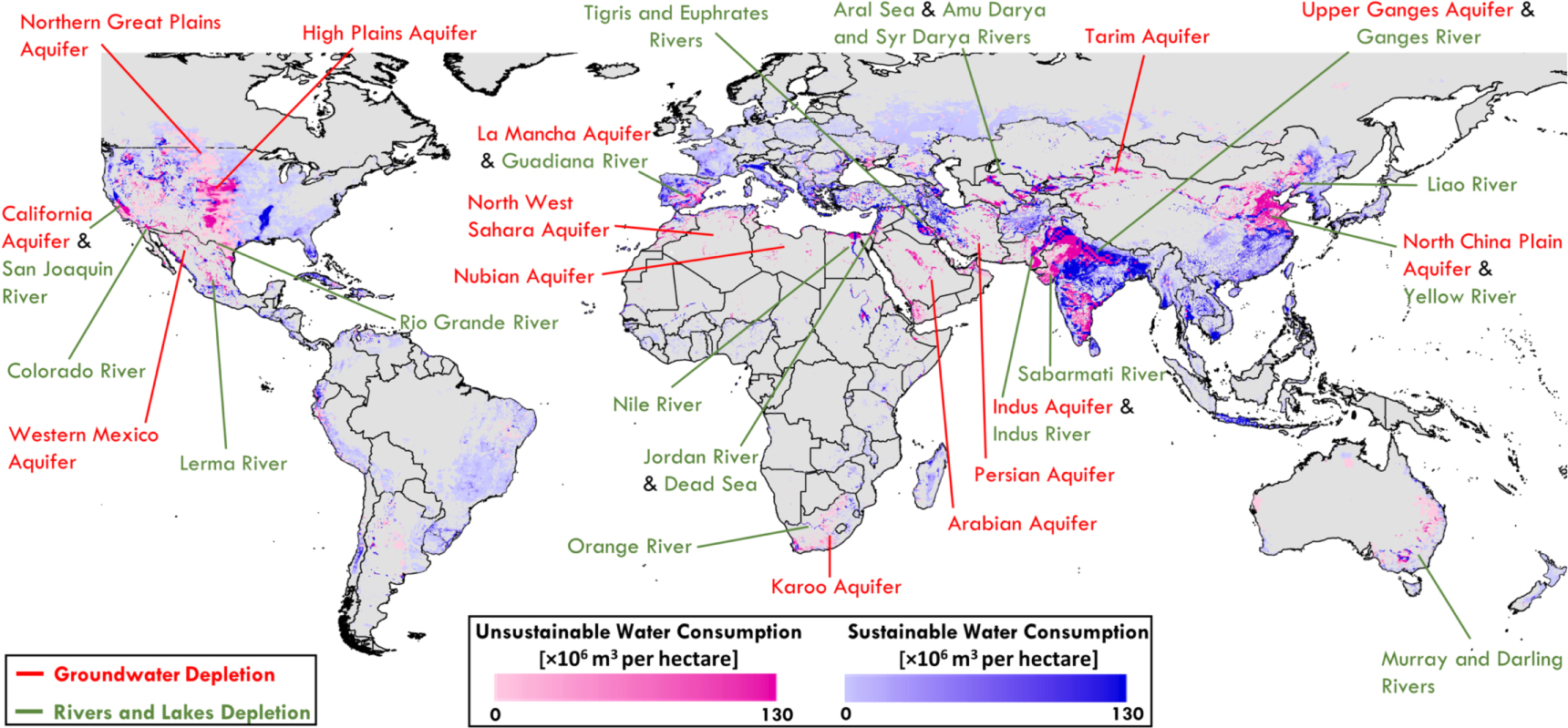 Figure 1. Global hotspots of unsustainable water consumption for irrigation. The map shows sustainable and unsustainable irrigation water consumption volumes and lists some of the freshwater stocks (aquifers, rivers, lakes) that are being depleted to grow crops (Richter 2014, Richey et al 2015, Jägermeyr et al 2017).