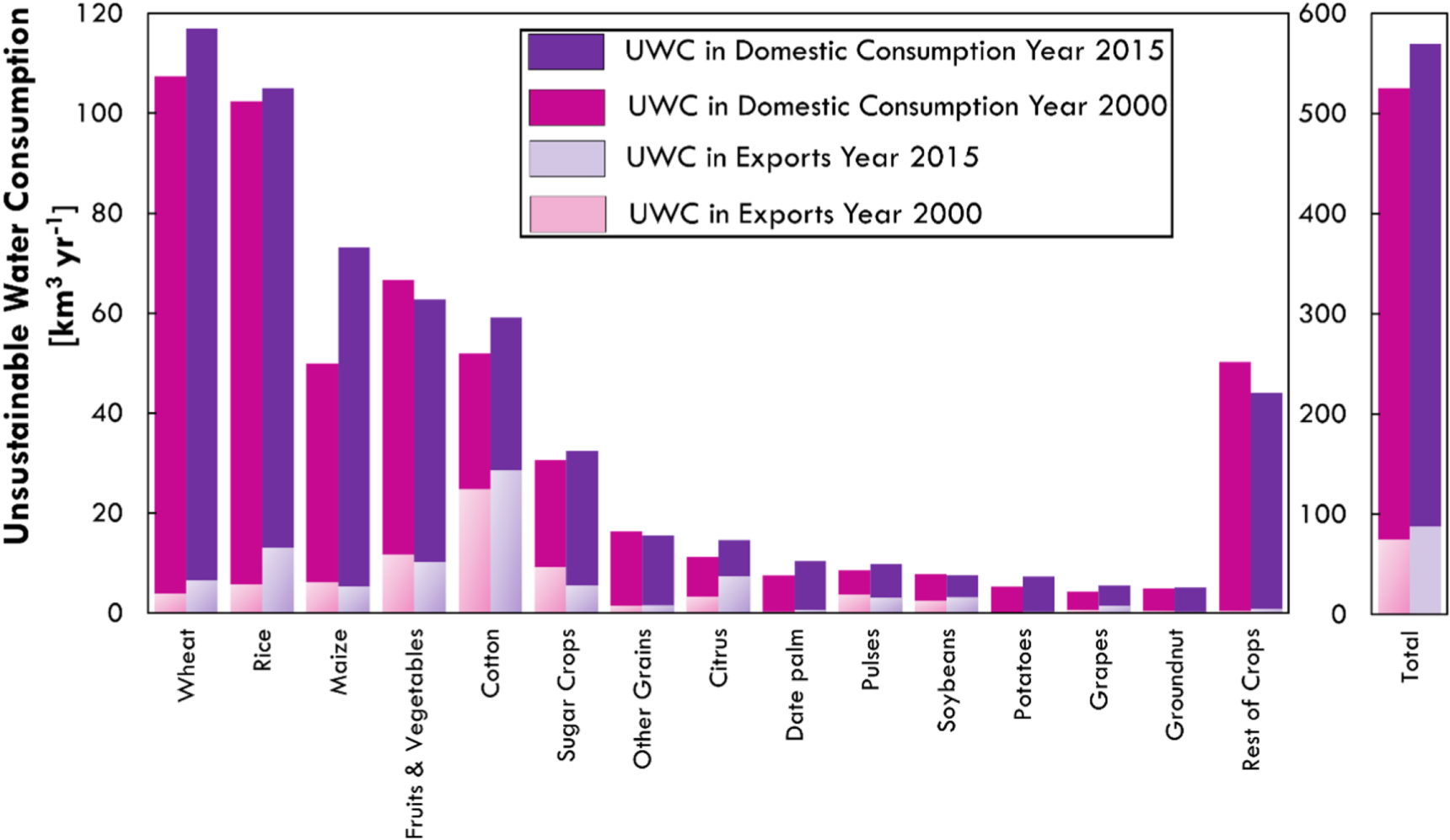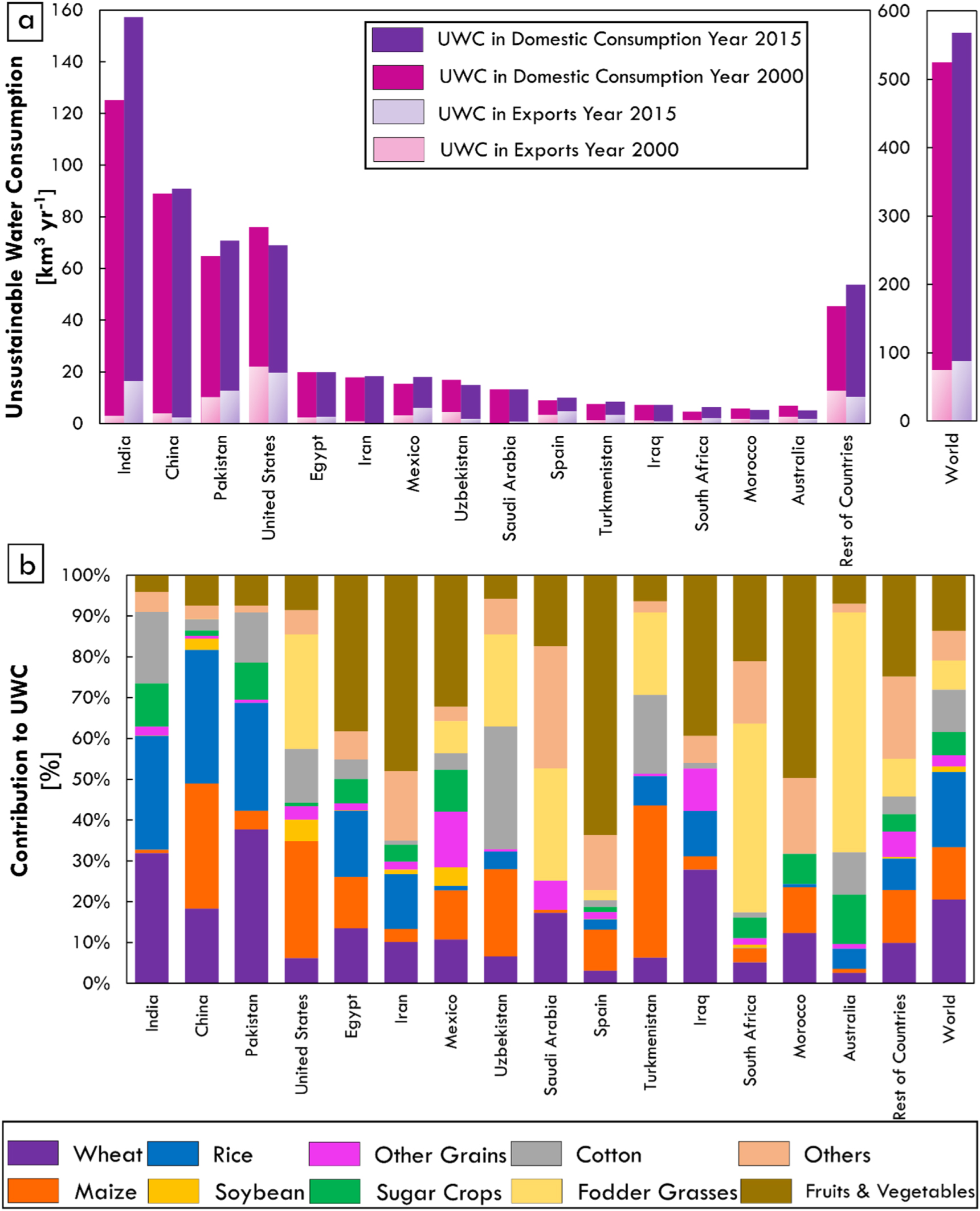 Figure 3. Crop-specific contribution to unsustainable irrigation water consumption (UWC) for domestic consumption and exports in year 2000 and 2015. Crops contributing the most to global UWC are wheat (21% or 117 km3 of global UWC), rice (18% or 105 km3), maize (13% or 73 km3), fruits and vegetables (11% or 63 km3), cotton (10% or 59 km3), and fodder grasses (7% or 41 km3). Crops contributing the most to international UWC trade are cotton (33% or 29 km3), rice (15%), fruits and vegetables (12%), citrus (8%), wheat (7%), maize (6%), sugar cane (6%), and soybeans (4%). In the 2000–2015 period, UWC embedded in traded rice, wheat, citrus, cotton, and soybean has increased by 130%, 66%, 125%, 15%, 31%, respectively.