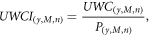 We then assessed unsustainable irrigation water consumption intensity (UWCI) of each MIRCA2000 crop class (M) in each country (y) and year (n), as follows: