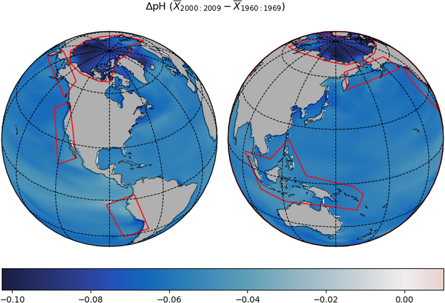 Figure 4. Modeled change in average surface ocean pH from 1960–1969 to 2000–2009. Red boxes demarcate the regions examined in detail in this study.