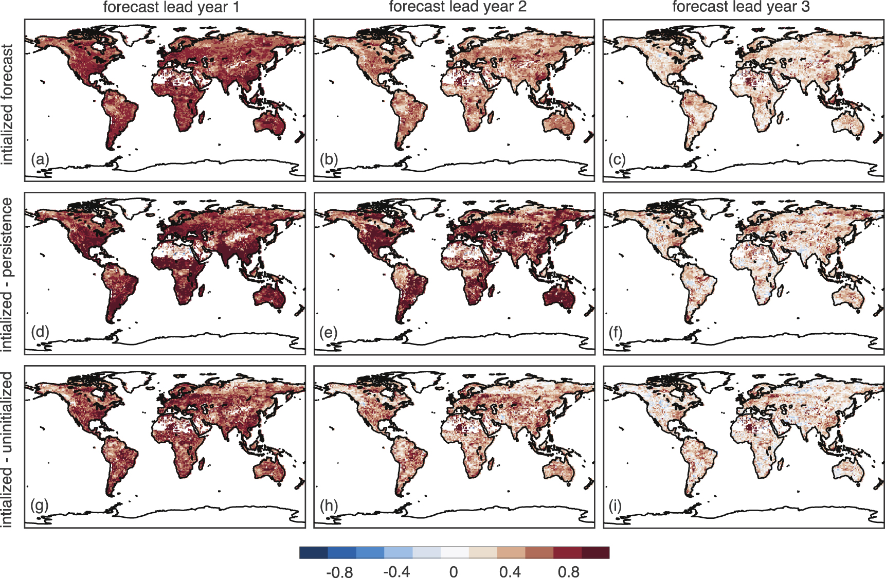 Standard image High-resolution imageFigure 3. (First row) Predictability of net ecosystem production, as indicated by the correlation coefficient of the CESM-DPLE initialized forecast with CESM-LE member #34. (Second row) The gain in predictability (difference in correlation coefficients) from the initialized forecast relative to the persistence forecast. (Third row) The gain in predictability (difference of correlation coefficients) from the initialized forecast relative to the uninitialized forecast. First column corresponds to forecast lead year 1, second column to forecast lead year 2, and third column to forecast lead year 3.