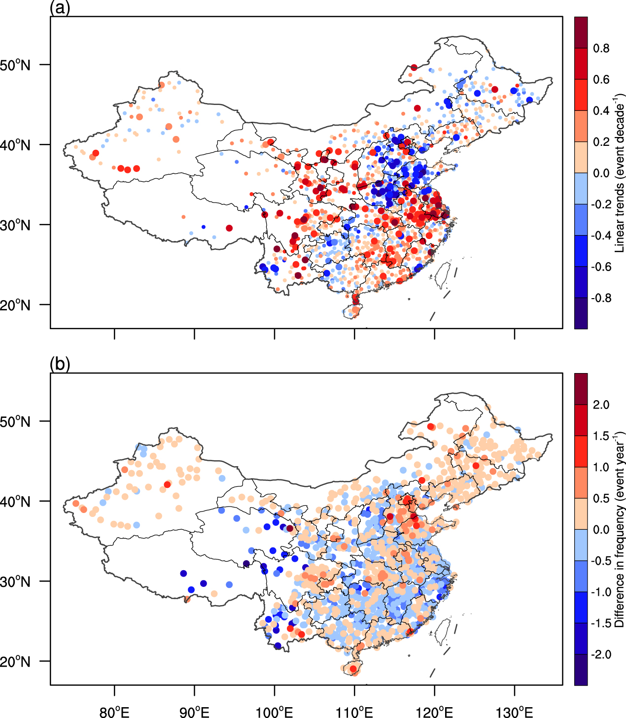 Figure 2. Linear trends for frequency (events decade−1) of winter temperature whiplash events during 1980–2018. (a) for W2C events, i.e. a transition from warm to cold extremes; (b) for C2W events, i.e. a transition from cold to warm extremes; (c) for W2C&C2W, total events of W2C and C2W type. Significant trends at the 0.1 level at least are highlighted by larger size. The significance is attached only to those stations in which whiplash events occurred in different 15 years at least.