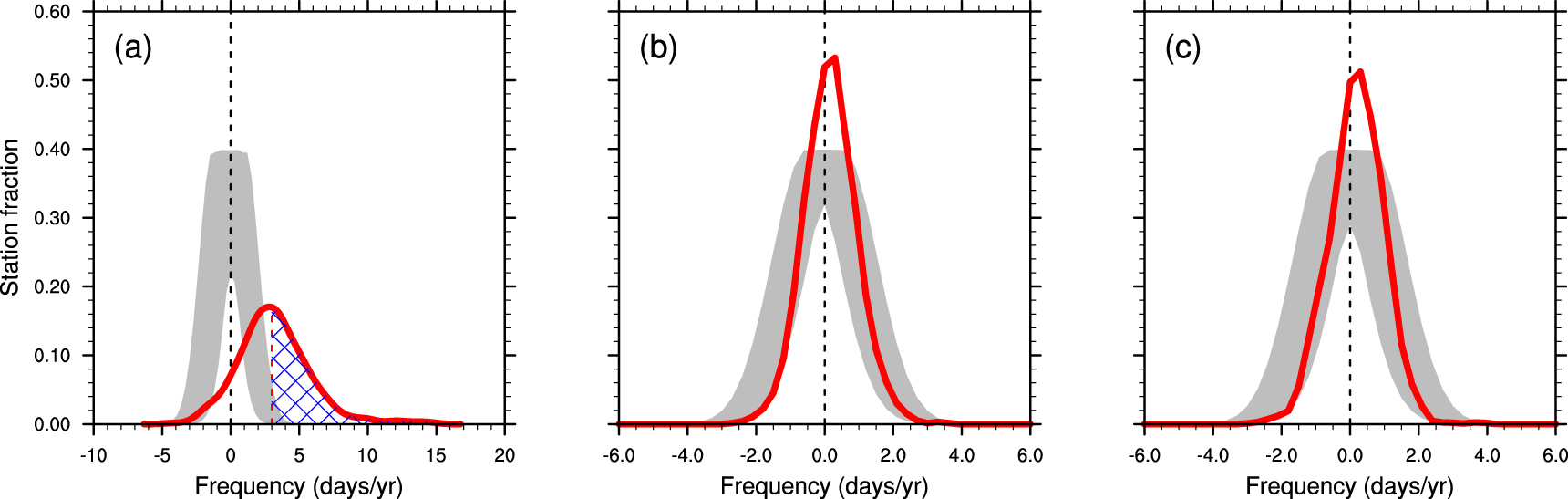 Figure 5. Probability density function of the station fraction experiencing a certain magnitude of changes between pairwise 15 year (2004–2018 versus 1980–1994) average frequency of whiplash events (W2C&C2W). Red curves show observed differences and light-gray shadings frame the 5%–95% range expected due to internal variability alone estimated from the bootstrap procedure (N = 1000, see methods). (a) A schematic diagram for detection adapted from Chen et al (2018). The dashed red line locates the 95th percentile amongst those bootstrapped samples of changes. The role of external forcings is deemed detectable in the fraction of stations hatched by blue. (b) Changes in whiplash events based on raw Tmax and Tmin. (c) Changes in whiplash events based on linearly-detrended Tmax and Tmin.