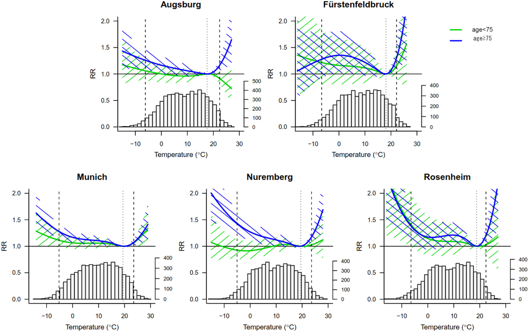 Figure 2. Location-specific exposure-response associations. Age-specific cumulative exposure-response association in five locations: Exposure-response associations presented as best linear unbiased prediction with 95% eCI (shaded) and temperature distributions during the baseline period. Dotted lines represent the minimum mortality temperature, dashed lines the 2.5th and the 97.5th percentiles, respectively. RR=relative risk.