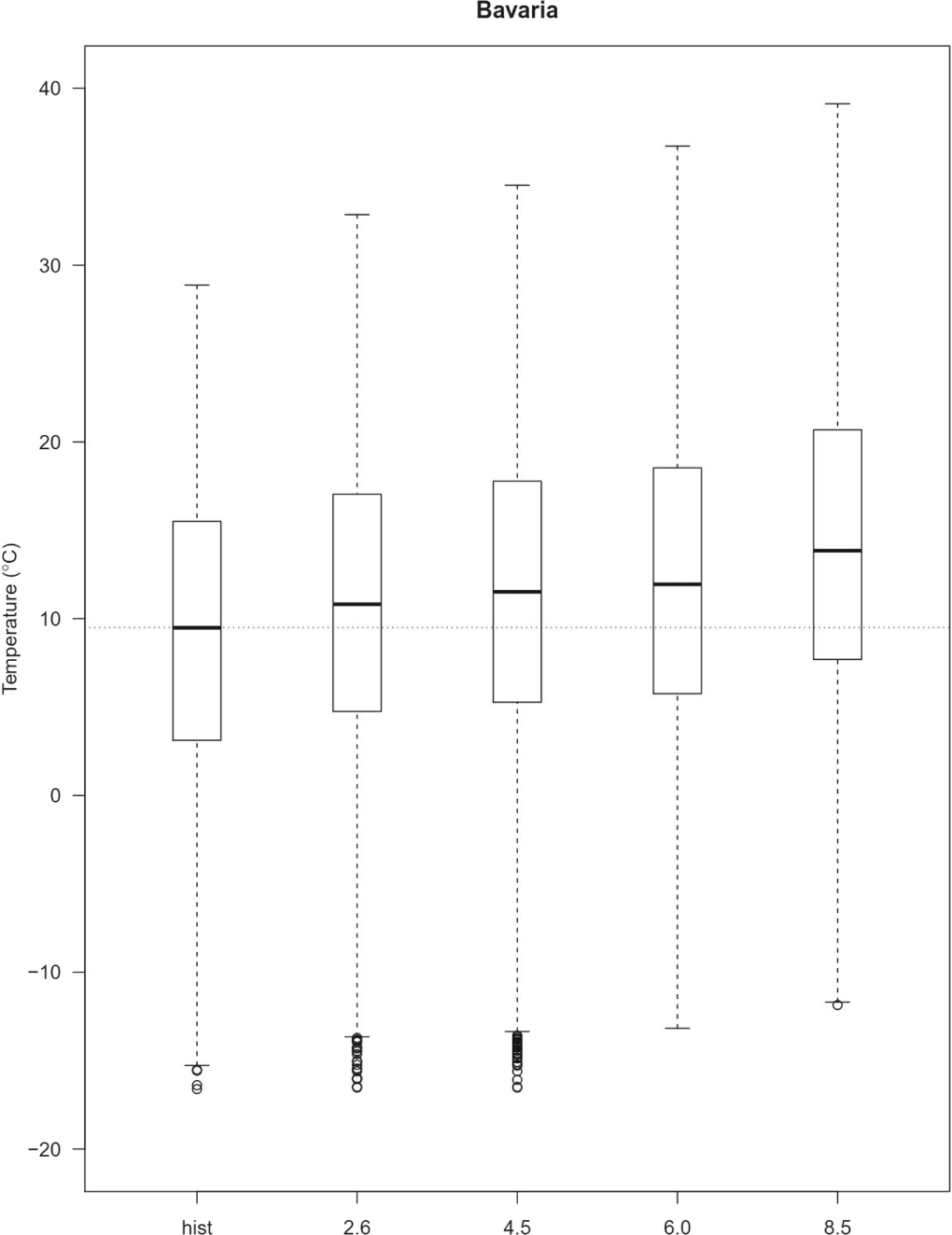Figure 3. Baseline and projected calibrated annual mean temperature of Bavaria for the baseline period (hist) and the different RCPs.