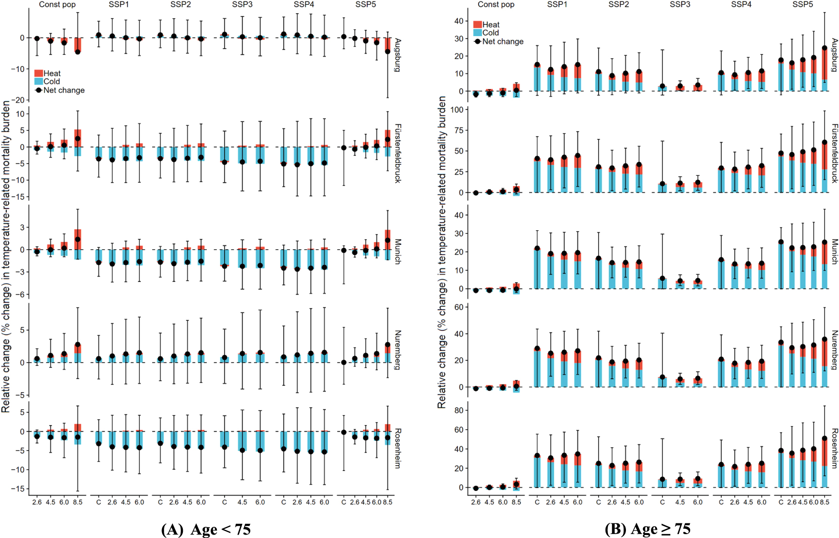 Figure 6. Projected relative change (%) in the heat-related, cold-related and net temperature-related mortality with 95% eCI in the five Bavarian cities under different climate and population change scenarios during the future period (2083–2099) as compared to the baseline period (1990–2006). const pop = constant population; C = constant climate, 2.6 = RCP2.6, 4.5 = RCP4.5, 6.0 = RCP6.0, 8.5 = RCP8.5. Relative change (%) projected with the location-specific age-specific (considering the age-specific population growth factor) and the overall all age (considering the overall population growth factor) ERFs.