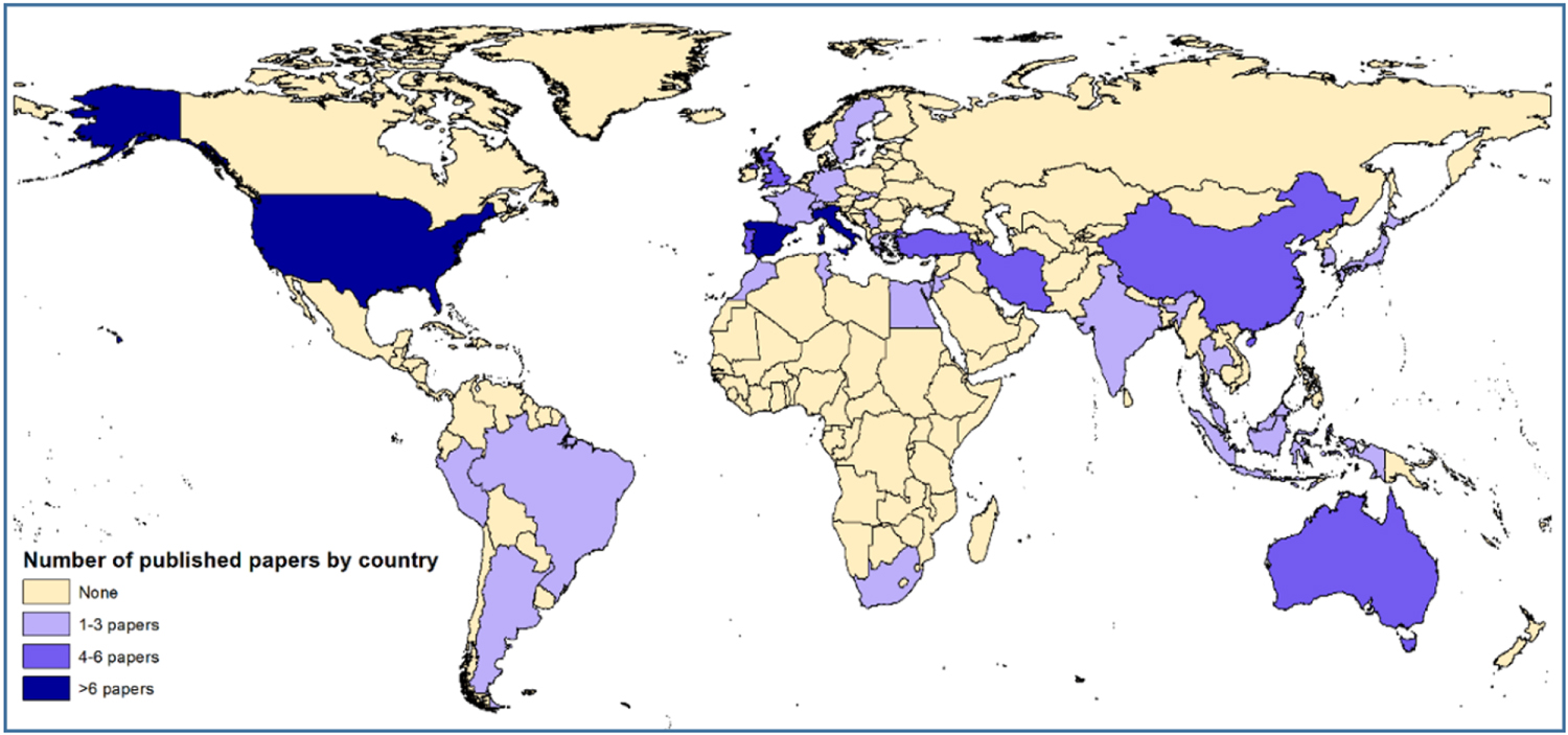 Figure 2. Geographical spread of experiments on fruits, nuts and seeds reported in papers identified for this systematic review.
