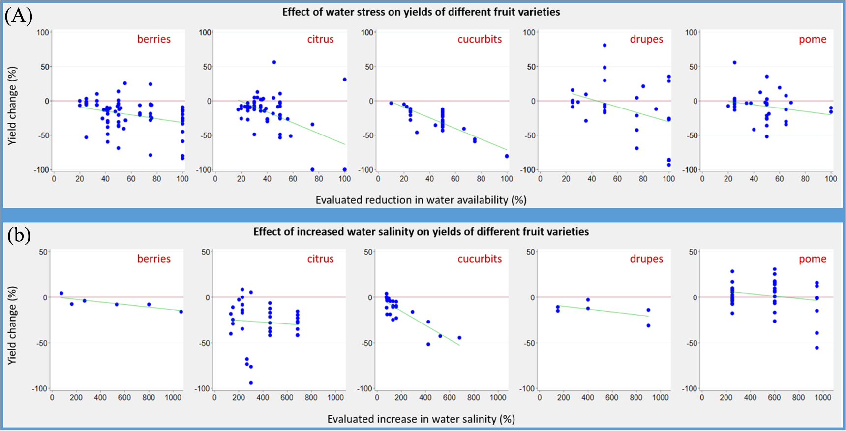 Figure 3. (A) Change in fruit yield in response reduced water availability—by crop group and (B) Change in fruit yield in response increased water salinity—by crop group.