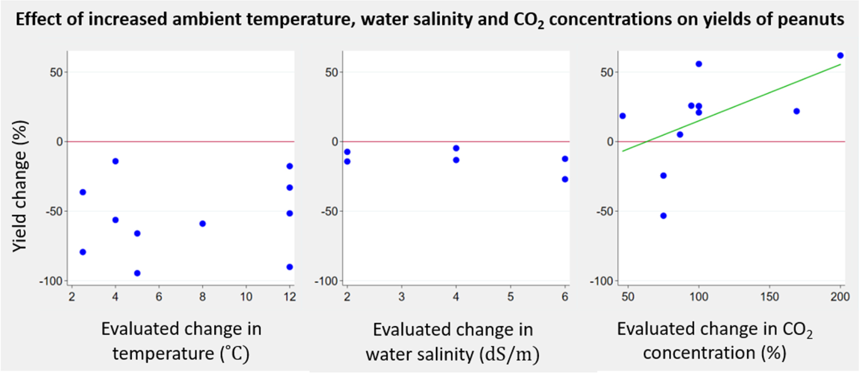Figure 6. Change in yields of peanuts in response to change of temperature, salinity levels and CO2 concentrations—by crop group.