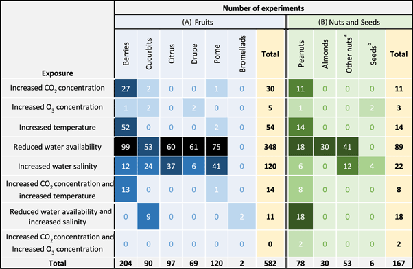 Table 1. Number of experiments carried out for each crop, by type of environmental exposure—combining experiments measuring impact on yields and experiments measuring impact on nutritional quality of (A) Fruits and (B) Nuts and Seeds. (Shading by quintiles)a,b.
