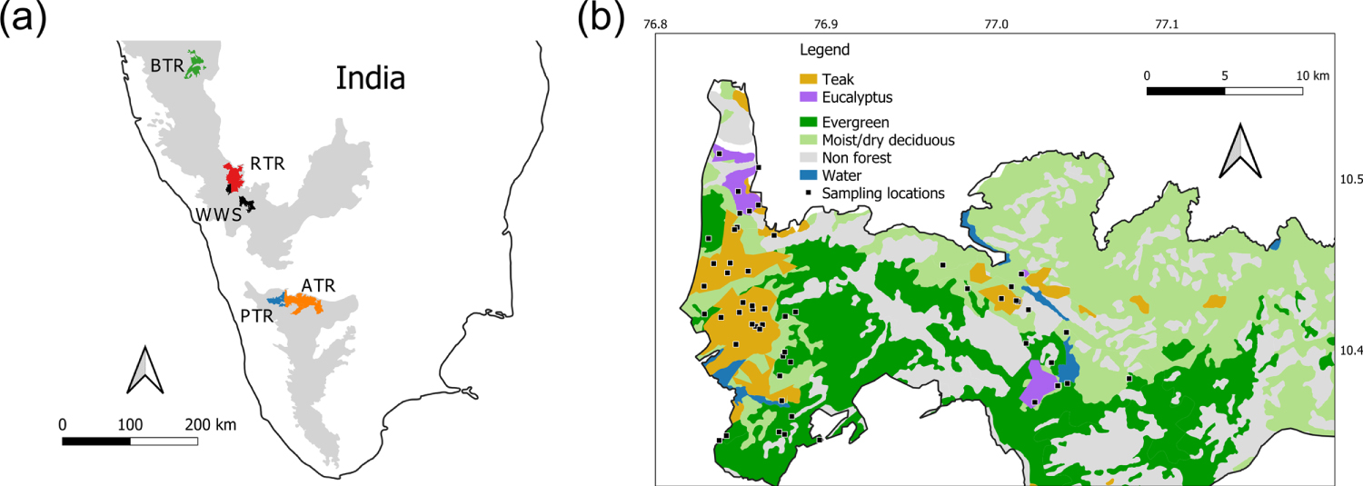Figure 1. Maps of study sites showing (a) locations of Anamalai Tiger Reserve (ATR), Parambikulam Tiger Reserve (PTR), Wayanad Wildlife Sanctuary (WWS), Rajiv Gandhi Tiger Reserve (RTR) and Bhadra Tiger Reserve (BTR) in the Western Ghats (shaded grey), and (b) major vegetation types and general sampling locations in the north-western portion of Anamalai Tiger Reserve. Individual plot locations not marked on the map.