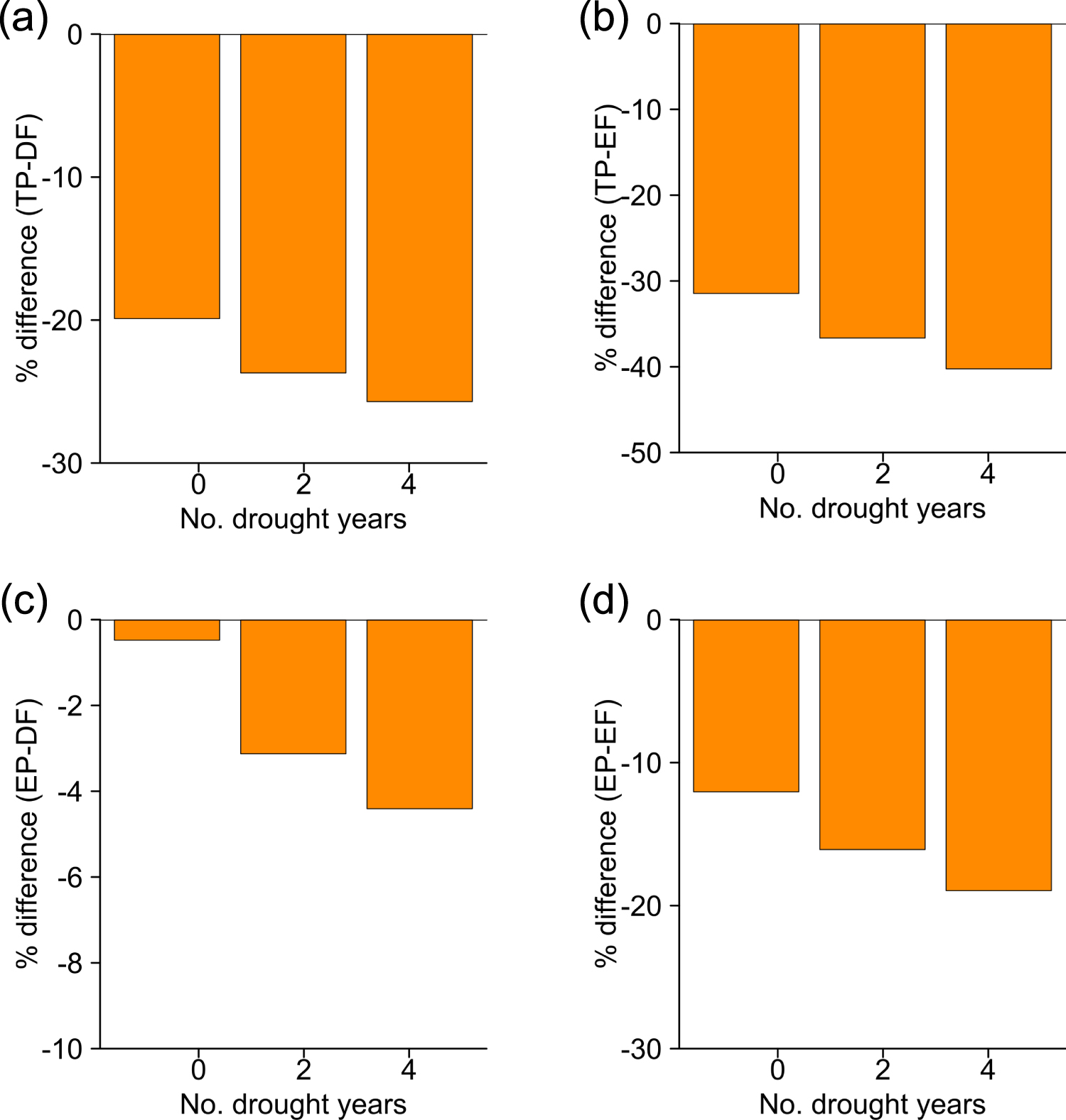 Figure 6. Results of bootstrapping simulations showing changes in estimated % difference in cumulative C capture (average dry season EVI) between plantations (TP and EP) and forests (EF and DF) with increasing drought frequency: 0, 2 and 4 drought years out of 10. Note that y-axis ranges differ across panels.