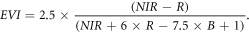 The Enhanced Vegetation Index (EVI) is an index of photosynthetically active vegetation derived from remotely sensed reflectance in near-infrared (NIR), red (R) and blue (B) wavelengths (Huete et al 2002). This index is known to correlate positively with field-based estimates of gross primary production (GPP), or C capture via photosynthesis (Rahman et al 2005, Huete et al 2006, Glenn et al 2008, Huete et al 2008).