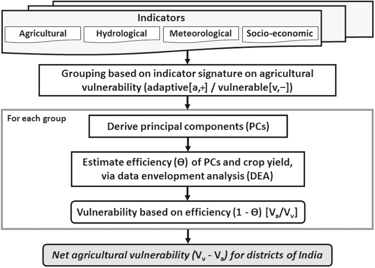 On procuring all the indicators, we performed Principal Component Analysis (PCA) for each segment to decorrelate the data matrix and make it dimensionless to ensure a reliable comparison. We selected Principal Components (PCs) explaining 80% of the variability in indicators of both the segments for 2001 and 2011 census decades. These PCs were then considered as input in a robust nonparametric data envelopment analysis (DEA) [28] framework to obtain the rankings of each decision-making unit (DMU), which, in this case, were the districts of India. The rationale of considering DEA over other competing approaches such as cluster analysis, averaging and standard deviation has been discussed in supplementary Text 1. Here, observed crop yield was considered as output in the DEA framework. The rankings were derived in terms of efficiency (ϴ), which were measured by the distance of input-output vectors to discrete piecewise frontier as estimated by a set of Pareto-efficient DMUs, through linear programming. A DMU will be considered technically efficient (a high value of ϴ) if it uses the same amount of inputs (or less) to produce a given amount of output, compared to the other DMUs. Thus, an inefficient DMU (1-ϴ) is the one that is incapable of using available inputs to produce a given output, which implies its vulnerability [29, 30]. Among different DEA models available, we used the Banker–Charnes–Cooper (BCC) [31] model because of its wide applicability. Here, net vulnerability of a DMU was the difference between measures derived from each segment. The proposed methodology has been illustrated in figure 1, which was used to derive the agricultural vulnerability of rice and wheat crops for both the census decades.