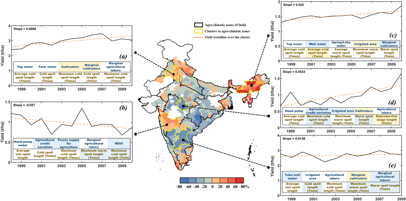 Figure 2. Decadal percentage changes in rice vulnerability (as represented in the color bar). Panels around the map represent Mann–Kendall trends and Sen's slope of crop yields for each cluster. Hotspots for clusters of districts located within the agro-climatic zones of trans-Gangetic plains (a), western plateau and hills (b), eastern Himalaya (c), central plateau and hills (d) and southern plateau and hills (e) were considered for rice. Five most influential indicators of adaptation (blue-text) and vulnerability (brown-text) segment, as derived through PCA, are provided for each cluster. Blue (orange) shading for indicators depict significant decreasing (increasing) impacts on decadal changes in the rice vulnerability.