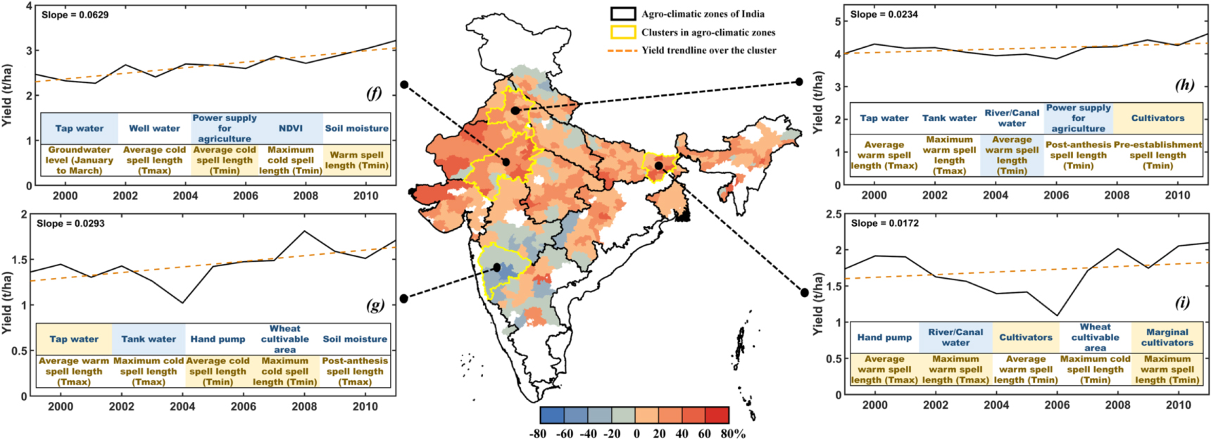 Figure 3. Similar to figure 2 but for wheat. Panels around the map represent trends of crop yield and the most influential indicators of clusters of districts located within agro-climatic zones of central plateau and hills (f), western plateau and hills (g), trans-Gangetic plains (h) and middle Gangetic plains (i).