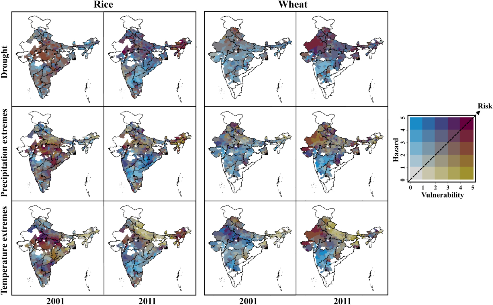 Figure 4. Bivariate agricultural risk map to drought (top panel), precipitation extremes (middle panel) and temperature extremes (bottom panel) for both the rice and wheat crops in census decades 2001 and 2011. Bivariate mapping can provide an effective understanding of the individual/marginal and combined/joint intensity of both the components. The representation of agricultural risk levels is provided in the right corner of panel in the form of a choropleth, wherein the agricultural vulnerability and hydro-climatic hazard components are depicted with variable yellow and blue intensities, respectively. The combination of yellow and blue colors provides information pertaining to the agricultural risk at different levels.