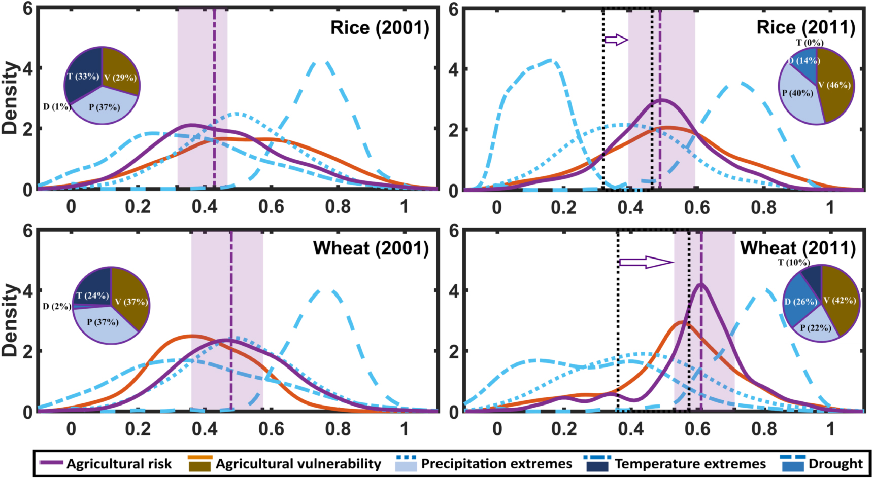 Figure 5. Nation-wide spatial variability in the overall agricultural risk, agricultural vulnerability and hydro-climatic hazards in terms of nonparametric Gaussian kernel probability distribution function (PDF). Purple-shaded region represents the density band greater than 2 for overall agricultural risk; black dashed-box in 2011 plot explicitly shows the density band of earlier decade (2001), with a shift from 2001 to 2011 census decade being depicted by horizontal arrow. Vertical purple dashed–dotted line represents the median of overall agricultural risk PDF. Inset pie-charts shows the percentage area of agricultural vulnerability (V), precipitation extremes (P), temperature extremes (T) and drought (D) PDFs in the purple-shaded density band.