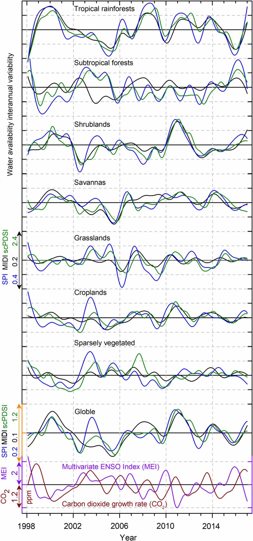 Standard image High-resolution imageThe IAV of water availability fluctuated considerably and generally showed similar temporal changes as indicated by the MIDI, SPI, and scPDSI (figure 2). The phases and magnitude for water availability of different pixels would counteract or strengthen the overall IAV of regions, biomes, and the whole study region. The overall water availability was steadily increased until 1999 during and after La Niña, which mainly occurred over tropical rainforests, shrublands, and savannas. A rebound occurred around 2003 in particular over subtropical forests, shrublands, grasslands, croplands, and sparsely vegetated, following by a fast decrease associated with El Niño until 2005. Then water stress gradually released and reached the wettest condition in 2011 with responses to a strong La Niña event over tropical rainforests, shrublands, savannas, and croplands, and therefore provided abundant water and inducing exceptional terrestrial carbon sink in particular over Africa and Australia, consequently followed by lower CO2 growth rate (Bastos et al 2013, Poulter et al 2014). Whereas strong El Niño in 2015/2016 brought severe water deficits especially over Amazon rainforests and southern Africa savannas (Jiménez-Muñoz et al 2016), accompanied by a quick rise of CO2 growth rate (Chatterjee et al 2017).