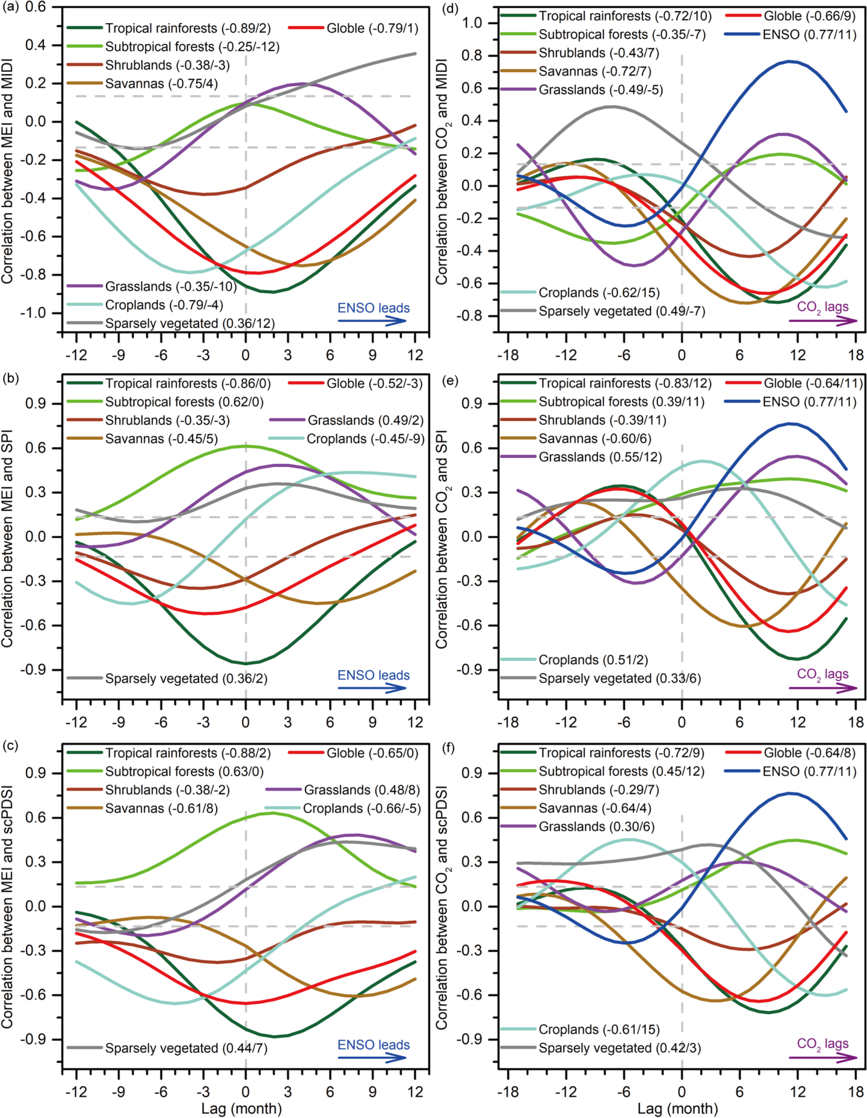 Figure 3. Cross-correlations of interannual variability among ENSO, water availability (MIDI, SPI, and scPDSI), and atmospheric CO2 growth rate across biomes. The peak correlation and corresponding lagged month are enclosed in the parentheses. Significance levels (p > 0.05) are shown between the gray horizontal dashed line.