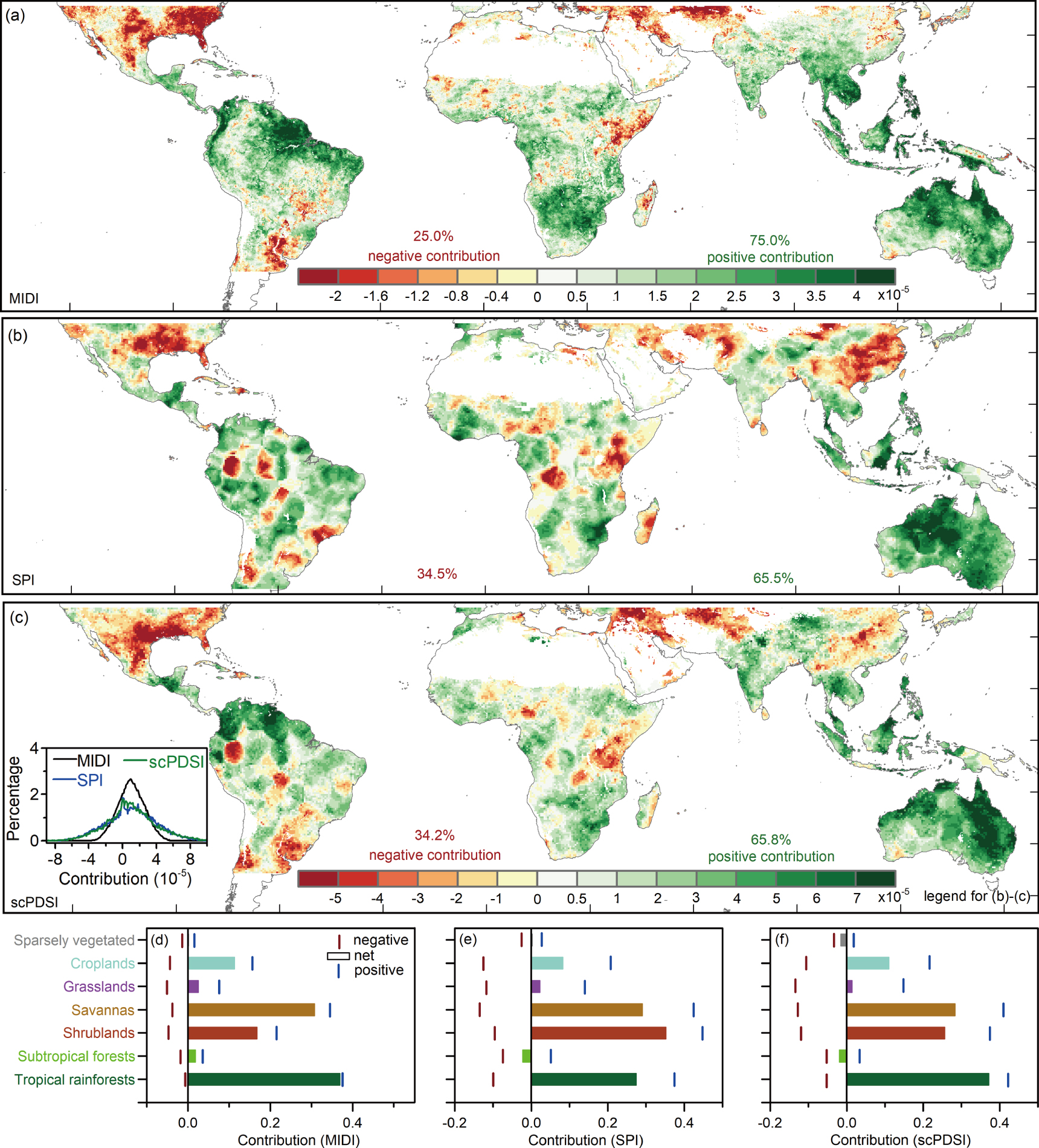 Standard image High-resolution imageIn addition to spatial patterns, contribution of MIDI showed a sharp shape with values distributed within ±0.000 04; but the SPI/scPDSI had a flatter shape with larger range (±0.000 09) (insetted within figure 4(c)). The range of contribution value and its percentage along strength may be determined by proportion difference between positive and negative contribution (MIDI: 50%, SPI: 31%, scPDSI: 31.6%). According to the contribution calculation method, the summed value of all pixels equals one (Ahlström et al 2015); while the proportion difference (MIDI) was larger, weaker negative values were needed to offset positive values. In contrast, the proportion difference of SPI/scPDSI was smaller, the counteracting effects required stronger values and more area with negative contribution, and therefore enlarging the range and showing a flatter shape in histogram distribution.
