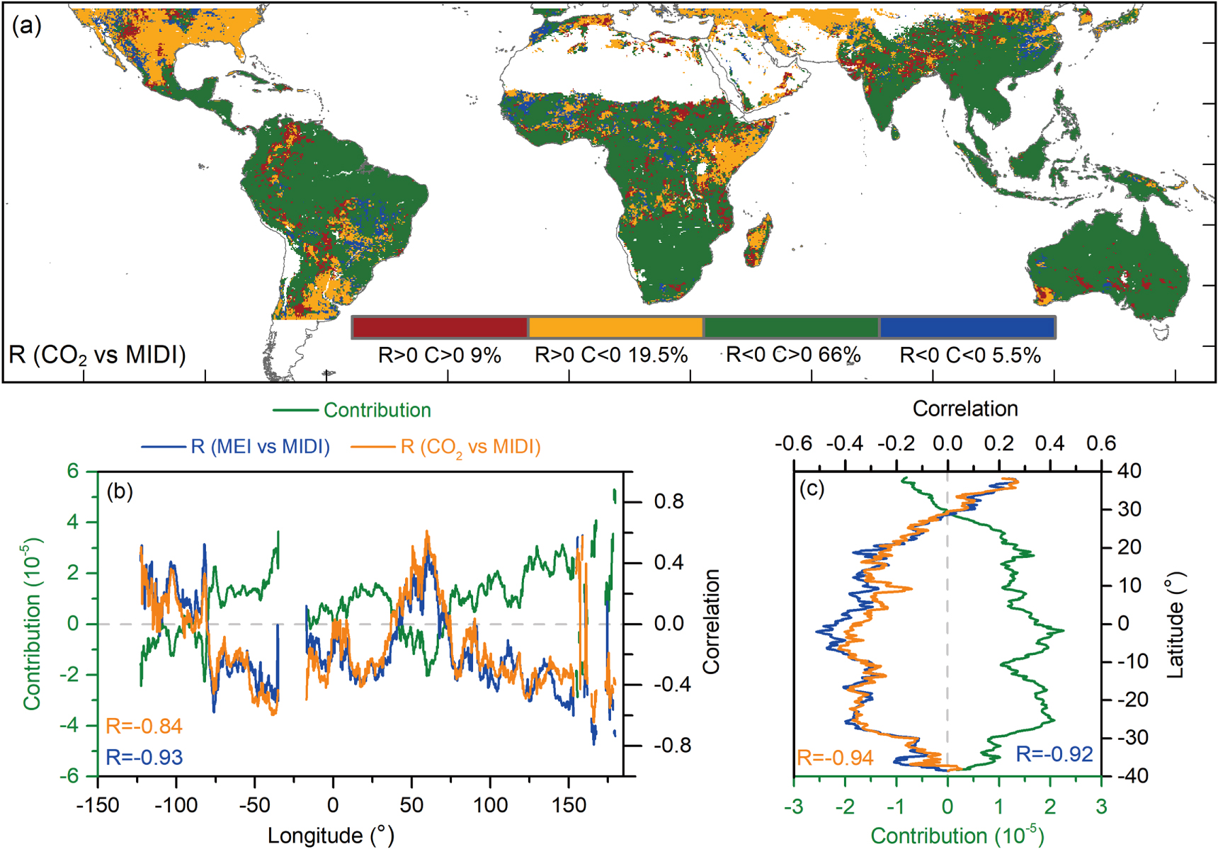 Figure 5. The reverse coupling phases in interannual variability of water availability (MIDI) and atmospheric CO2 growth rate/ENSO. (a) Spatial patterns of coupling phases between water availability and atmospheric CO2 growth rate, the spatial patterns between water availability and ENSO were exactly similar and not shown. Lines of correlation (R) and contribution (C) in (b), (c) are based on zonal mean values. The correlation efficiency between lines of orange/blue and olive are shown as orange/blue texts.
