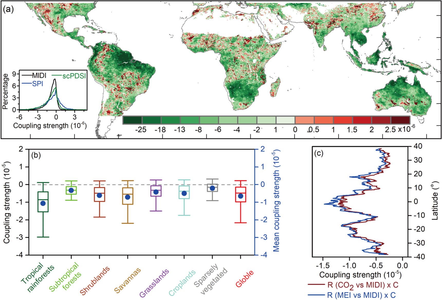 Figure 6. Characteristics in coupling strength between interannual variability of water availability (MIDI) and atmospheric CO2 growth rate/ENSO. The coupling strength in (a), (b) are calculated by R (correlation between MIDI and atmospheric CO2 growth rate) times C (water availability contribution), the higher in absolute values, the stronger in coupling strength. Percentage distributions of coupling robustness are insetted in (a).
