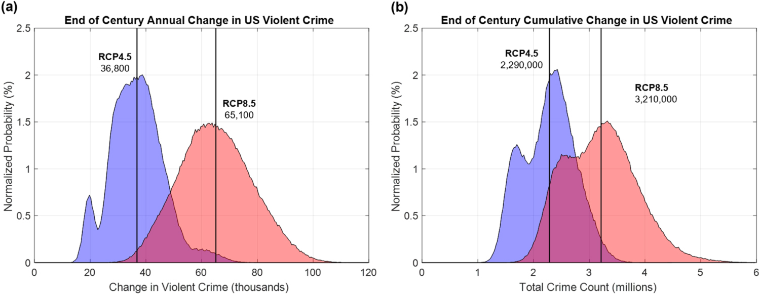 Figure 3. Change in US Violent Crime by the End of the Century. (a) Normalized probability distribution of expected annual additional violent crimes for the US at the end-of-century under RCP4.5 and RCP8.5 forcing experiments. (b) Same as (a) but for cumulative totals for the US from 2020 to 2099. Vertical lines and their labels represent means of the respective distributions.