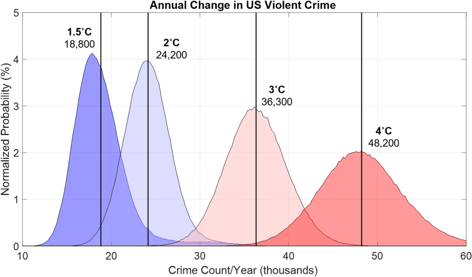 Figure 4. Expected Annual Change in US Violent Crime for Various Global Mean Warming Thresholds. Normalized probability distributions of US annual additional violent crimes expected for 1.5 °C, 2 °C, 3 °C, and 4 °C of global mean warming. Vertical lines and their labels represent means of the respective distributions.