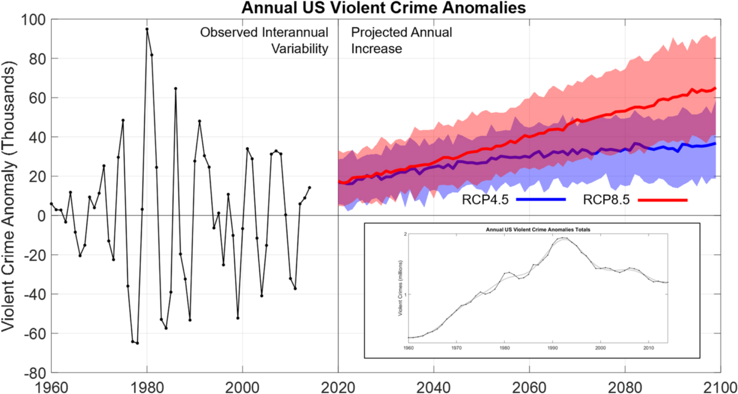 Figure 5. US Violent Crime Anomalies. Left Annual anomaly of US violent crime from the ten-year running mean. Right Projected annual increase of violent crimes for RCP4.5 (blue) and RCP8.5 (red) forcing scenarios. Inset Actual annual US violent crimes total (Federal Bureau of Investigation 2017) are plotted (black) alongside a ten-year running mean (thick gray).