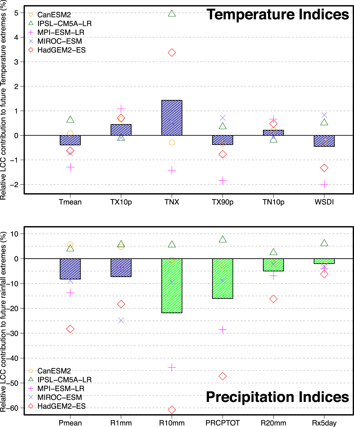 Figure 1. Globally-averaged regional relative contribution of future LCC to projections of mean and extreme weather indices (averaged over 2071–2100, RCP8.5 scenario). Bars (y-axis) correspond to percentage contribution of LCC relative to future projections with all other forcings (∣RCP8.5 − HIST∣) for each of the six temperature indices (upper panel) and six rainfall indices (lower panel, x-axis). Green bars correspond to robust multi-model changes (i.e. multi-model global mean significant at the 0.05 level and where four out of five models simulate the same global change sign). Each symbol represents the individual model contribution.