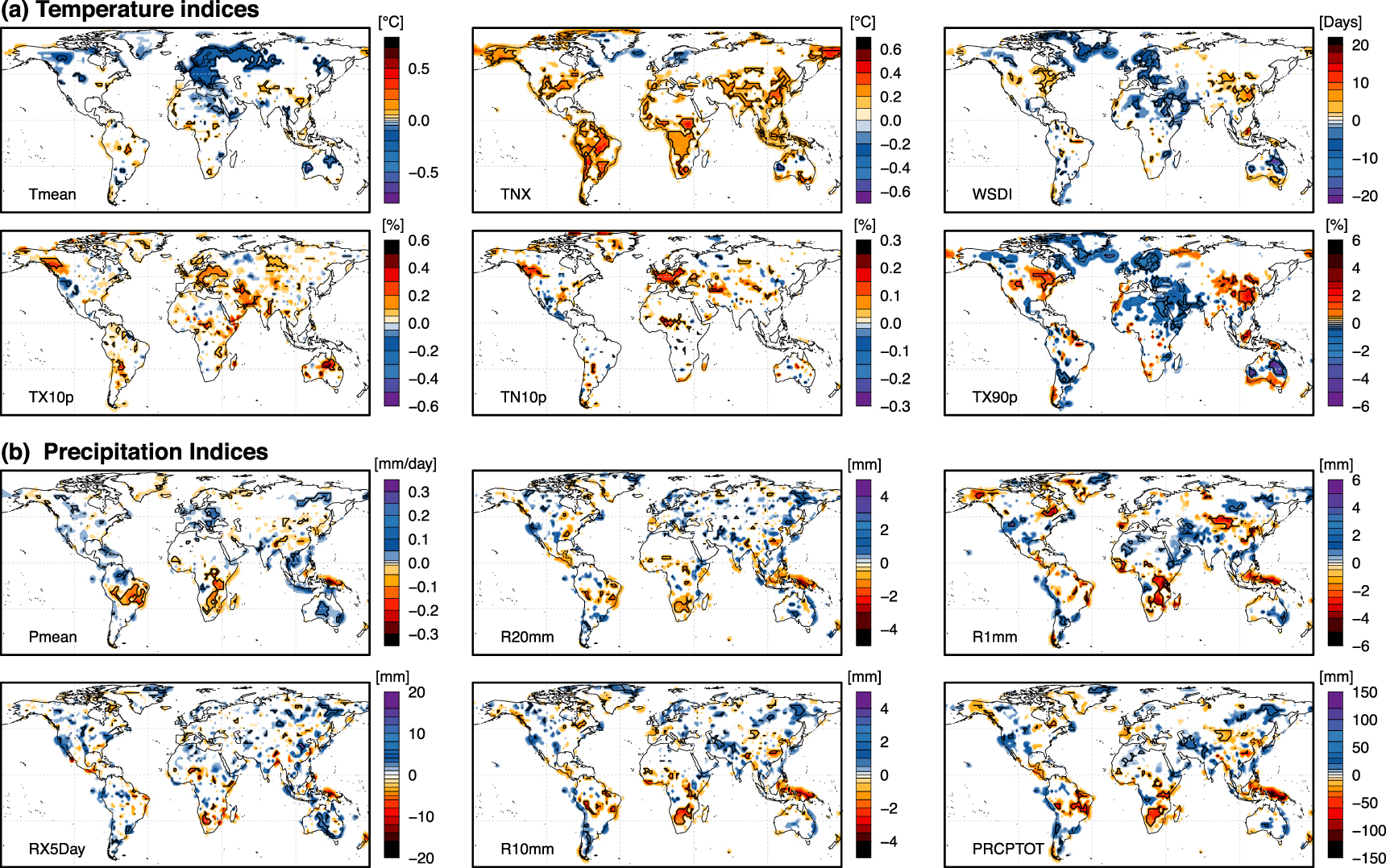 Standard image High-resolution imageFigure 2. Spatial patterns of changes in (a) temperature and (b) precipitation indices in response to future LCC (RCP8.5 scenario), averaged over 2071–2100. Mean and extreme weather indices are indicated in the bottom left corner of each panel (see Methods for the description of extreme weather indices). Only grid points where four out of five LUCID-CMIP5 models simulate the same anomaly sign and where changes are significant at the 0.05 level are shown (white/blank otherwise).