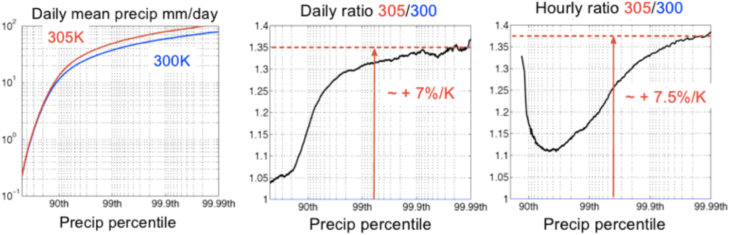 Figure 1. Values of daily precipitation extremes (i.e. high percentiles, left panel) in the cold (blue) and warm (red) simulations. The ratio between the warm and cold rainfall rates is shown in the middle panel. Similar results are obtained at hourly time scales (right panel, after Muller et al 2011), reproduced with permission, copyright [2011] AMS.