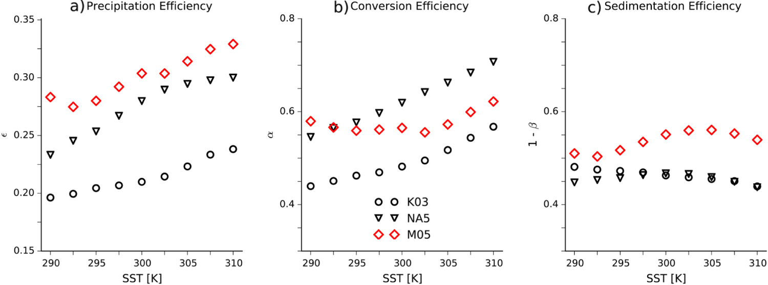 Figure 4. (a) Precipitation efficiency versus SST for three sets of CRM simulations. K03 and NA5 use single-moment microphysics, while M05 uses double-moment microphysics. (b) Contribution from conversion efficiency α. (c) Contribution from sedimentation efficiency 1 − β. Figure after (Lutsko and Cronin 2018), reproduced with permission.