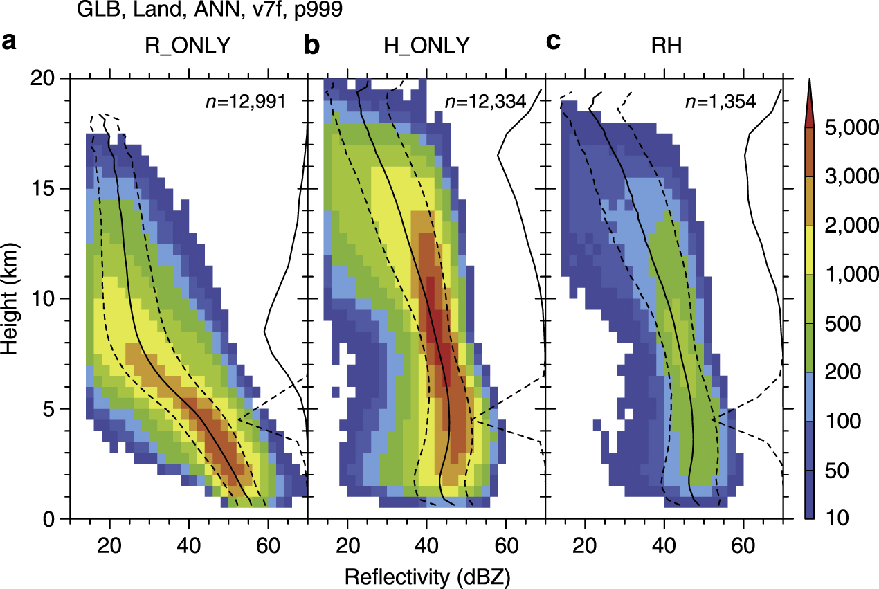 Figure 5. Composite structures of radar reflectivity at extreme pixels within the TRMM observation domain (37.5°S–37.5°N). Colours show joint histograms of effective radar reflectivity and height, superimposed by solid and dashed lines that indicate the mean and s.d. for each height bin, respectively. Solid and dashed lines along the right-hand axis of each panel show the histograms of echo-top heights and 0 °C levels, respectively. The number of samples for the corresponding extreme type is indicated. (a)–(c) R-only (extreme rainfall event), H-only (extreme convective event) and RH (both an extreme rainfall and extreme convective event) over land, respectively; adapted from Hamada et al (2015), reproduced with permission.