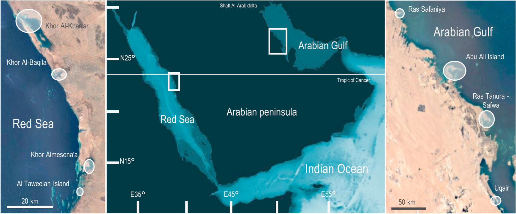 The Arabian Peninsula is an especially arid region of the globe, with most of the peninsula receiving very little rainfall on an annual basis (Almazroui et al 2012). This low precipitation results in minimal fluvial input of sediments anywhere along the coasts of the Red Sea or the Gulf coast. The Red Sea does not have any permanent rivers. The Arabian Gulf, on the other hand, receives water from the Shatt al Arab River in the north, which itself is a result of the confluence of the Tigris and Euphrates Rivers. The sediments of the Red Sea and Arabian Gulf originate mainly from carbonate deposits from seawater and deposited airborne sediment of terrestrial origin, which is reported to comprise up to one-third of Gulf sediments (Sugden 1963, Saderne et al 2018). Dust deposition from frequent dust storms originating in the Sahara and the Arabian Peninsula is believed to be one of the primary sources of nutrients to the Red Sea and the Gulf (Acosta et al 2013, Engelbrecht et al 2017).