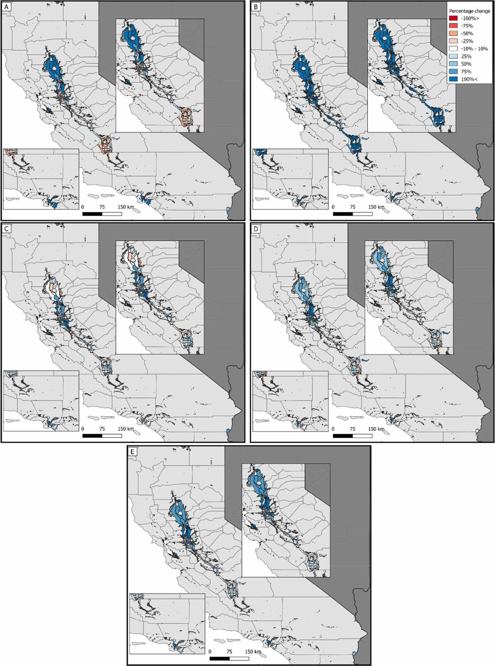 Figure 2. Percent changes in the spatial averaged magnitude of 100-year runoff in the projected period (2020–2099) relative to the baseline period (1950–2005) for (A) CanESM2, (B) CNRM-CM5, (C) HadGEM2-ES, (D) MIROC5, and (E) ensemble median of climate models under RCP4.5 scenario over the leveed region of California. Polygons show the levee protected regions in California. The color bar displays the percentage change [%] in the magnitude of 100-year runoff where the blue (red) color shows levee systems that magnitude of the 100-year runoff expected to increase (decrease) under a warming climate in the future. Inset maps in each panel show map of levee systems of California's central valley (right inset map) and levees over Southern California (left inset map).