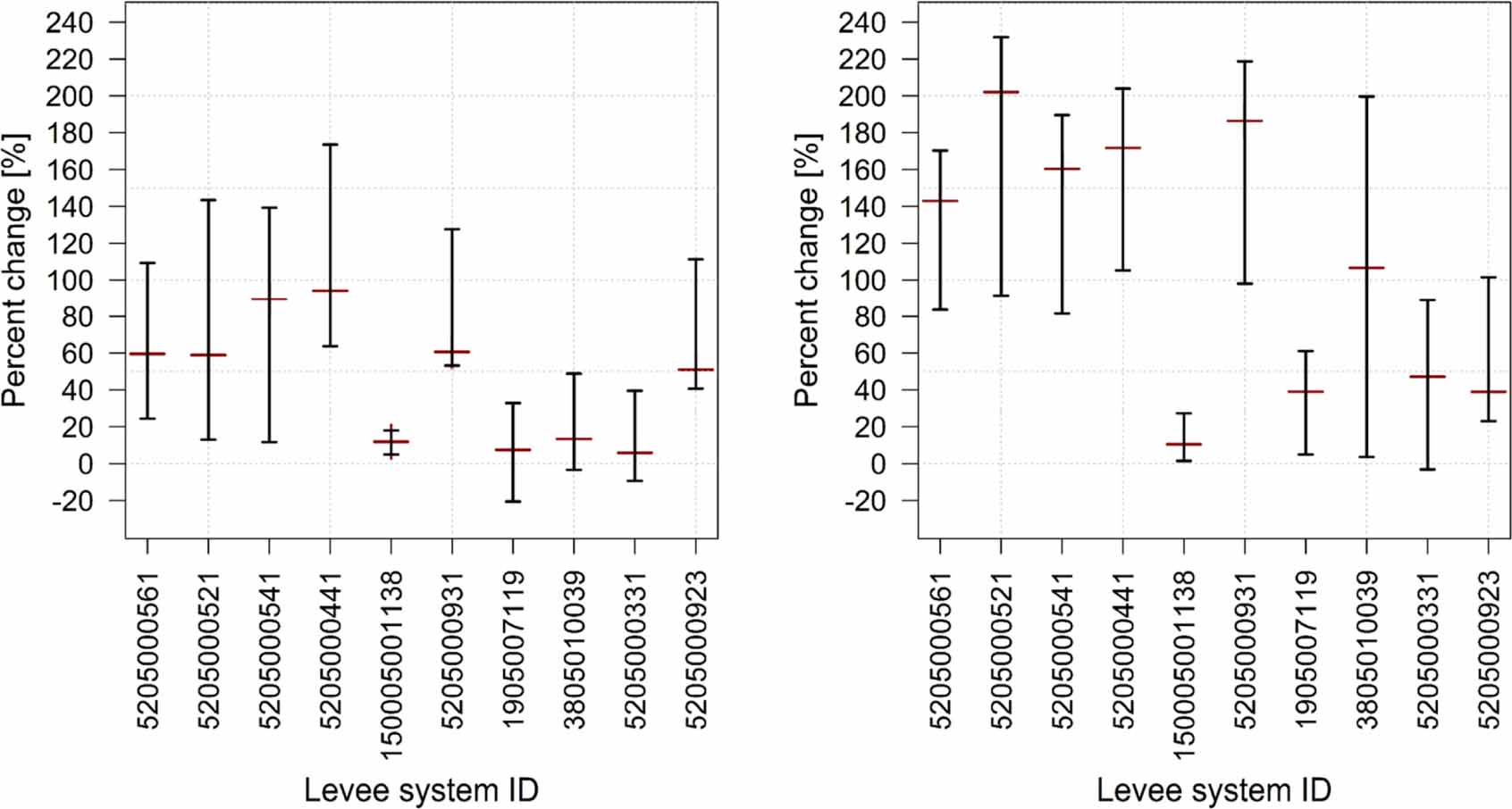 Figure 3. Percent changes between multimodel median of gridded simulated runoff associated with a projected 100-year flood level under RCP4.5 (left panel) and RCP8.5 (right panel) relative to the historical period (1950–2005) for the ten levee systems with highest levee protected area. The dark red line represents the projected multimodel median percent changes in annual maximum runoff relative to the historical record. The height of the black vertical bars represent the interquartile range (between 75th to 25th percentile) to summarize uncertainties associated with the use of different climate models and RCP scenarios.