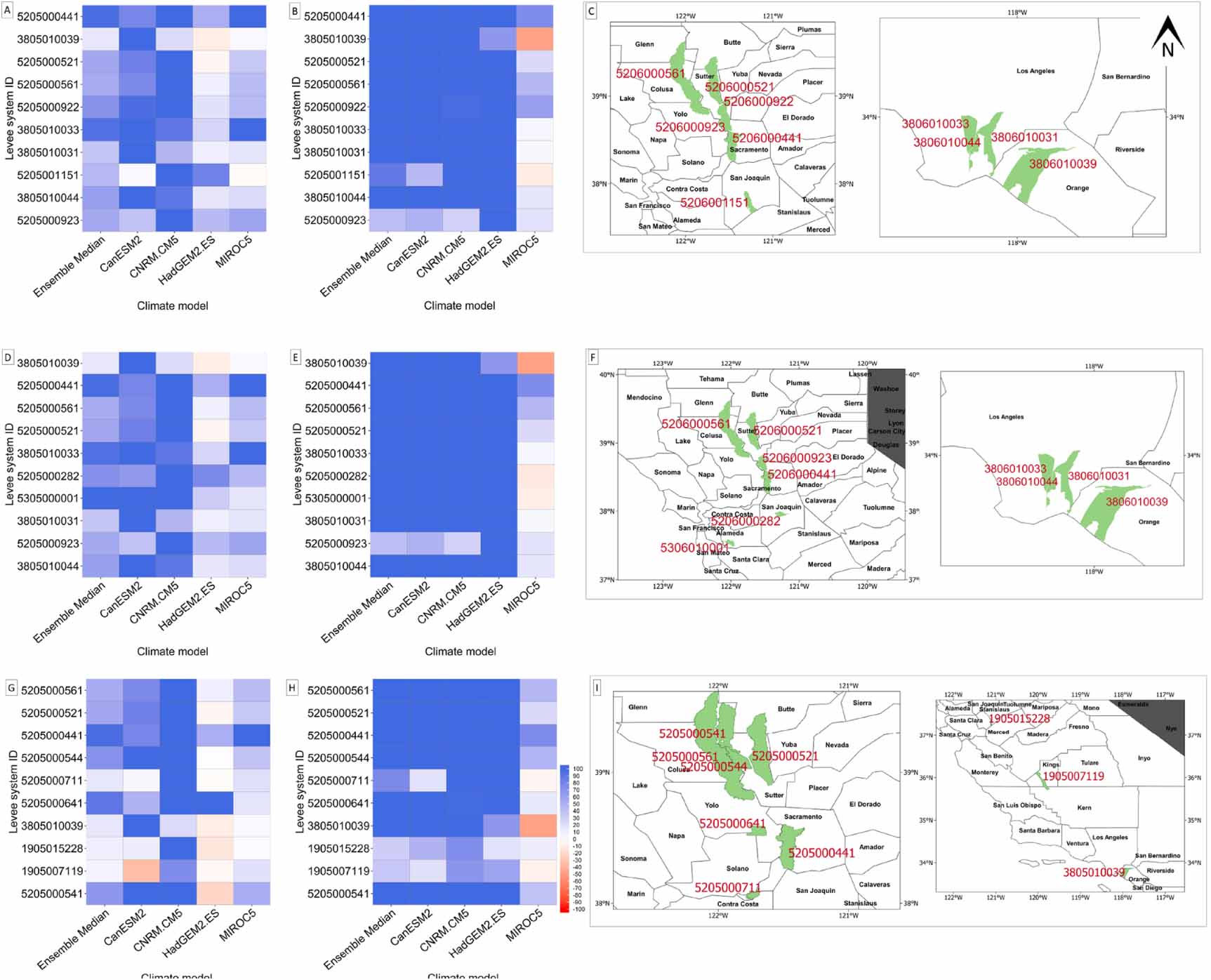 Figure 4. Heatmaps showing possible changes in the flood hazard in the future relative to the baseline period for each of the levee systems based on different climate models used in this study. In each of the heatmaps, the levee system are sorted descending based on the length of electric power transmission lines (panels A and B), roads (middle panels), and natural gas pipelines (bottom panels), where the topmost levee system on the y-axis represents the levee system that has the highest length of the particular infrastructure inside it. Left panels (A, D and H) depict the result for RCP 4.5 whereas the middle panels (B, E and H) represent future projections under RCP 8.5 scenario. The color bar shows the percentage change [%] in the magnitude of 100-year runoff. The blue (red) color displays levee systems that the magnitude of the 100-year runoff expected to increase (decrease) in the future. The right panels (C, F and I) show the locations of the levee systems and the county they are located in.