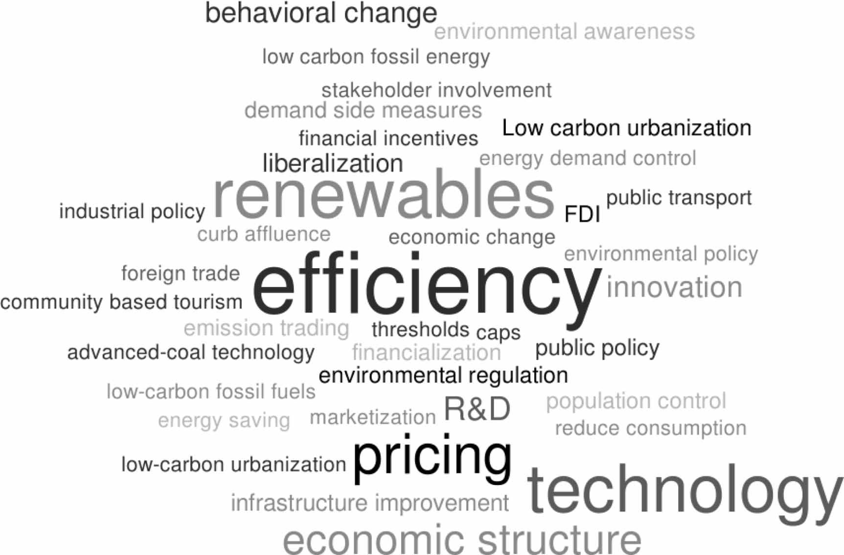 Figure 1 summarizes the strategies and policy recommendations given in the articles according to their frequency. Most interestingly, although many articles conclude that absolute decoupling is empirically rarely found, the recommendations to a large extent stick to a green growth repertoire of increasing efficiency, promoting renewable energy and introducing technological solutions and market-based mechanisms (e.g. internalizing or increasing environmental costs through pricing, attract foreign direct investments, financialization or emission trading). Many articles furthermore call for a restructuring of the economy that turns from fossil-energy intensive industrial production towards the service sector. The figure also shows that policy recommendations hardly contain any 'demand-side measures' (not even environmental awareness). Absolute reductions of resource use and emissions (as opposed to relative improvements) are mentioned in <2% of the subsample.