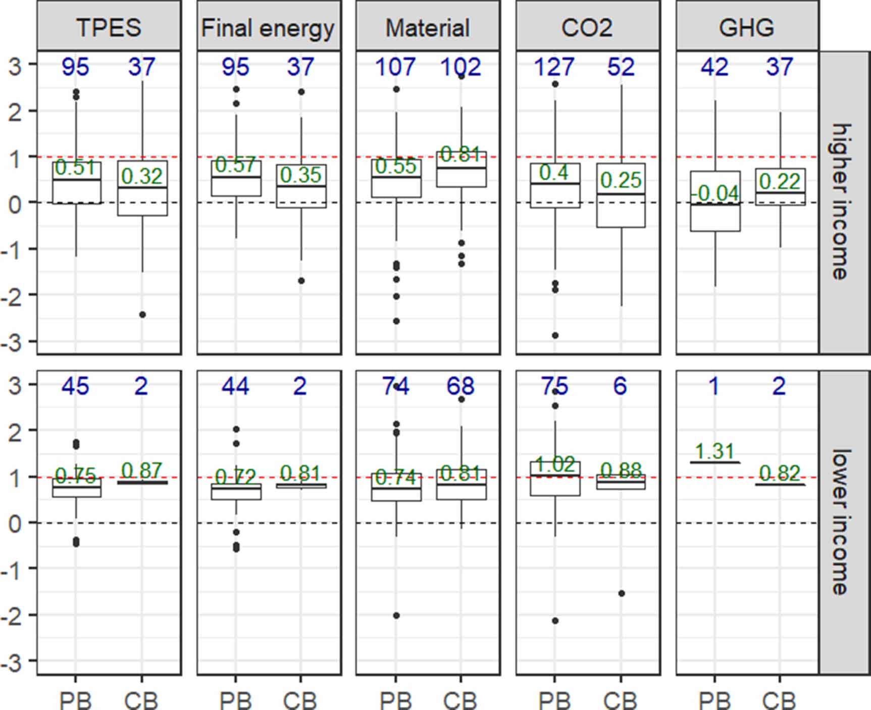 . A median elasticity of CO2 of 0.4 in the higher income class (top panels in figure 2) means that for 1% of GDP growth, production-based CO2 emissions grew by 0.4%. Elasticities below zero indicate absolute decoupling and elasticities >1 that resources/emissions grew faster than GDP. Results should be interpreted with caution in particular for those parts of figure 2 where data were only available for few countries (see sample sizes in blue font color). Median values of elasticities are close to one for most of the indicators in the low-income class, while they are often substantially lower than one for the higher income class. For the higher income class, elasticities of consumption-based (CB) indicators are highest for material use and substantially lower for CO2 and GHG. For the lower income class, the highest median values are found for production-based emissions. Negative elasticities, indicating absolute decoupling, are most frequent for production-based GHG emission accounts and consumption-based TPES and CO2 accounts for high income countries. For other indicators, instances of absolute decoupling also exist in the group of high-income countries, but are very rare for lower income countries. Thus, the results from our regression analysis over a 10-year timeframe are largely consistent with the main findings from our literature review.
