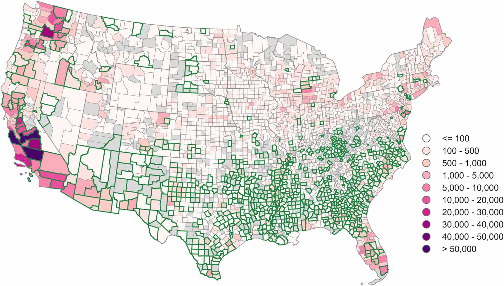 Figure 1. Spatial distribution of agricultural workers and social vulnerability. Number of summertime hired crop workers (MJJAS maximum of 2009–2018 average monthly values) as reported by the Bureau of Labor Statistics Quarterly Census of Employment and Wages [24]. Counties outlined in dark green are in the upper quartile of the Center for Disease Control's Social Vulnerability Index [41], indicating low community resilience to disaster events. Counties with no employment data are shown as missing values in gray.