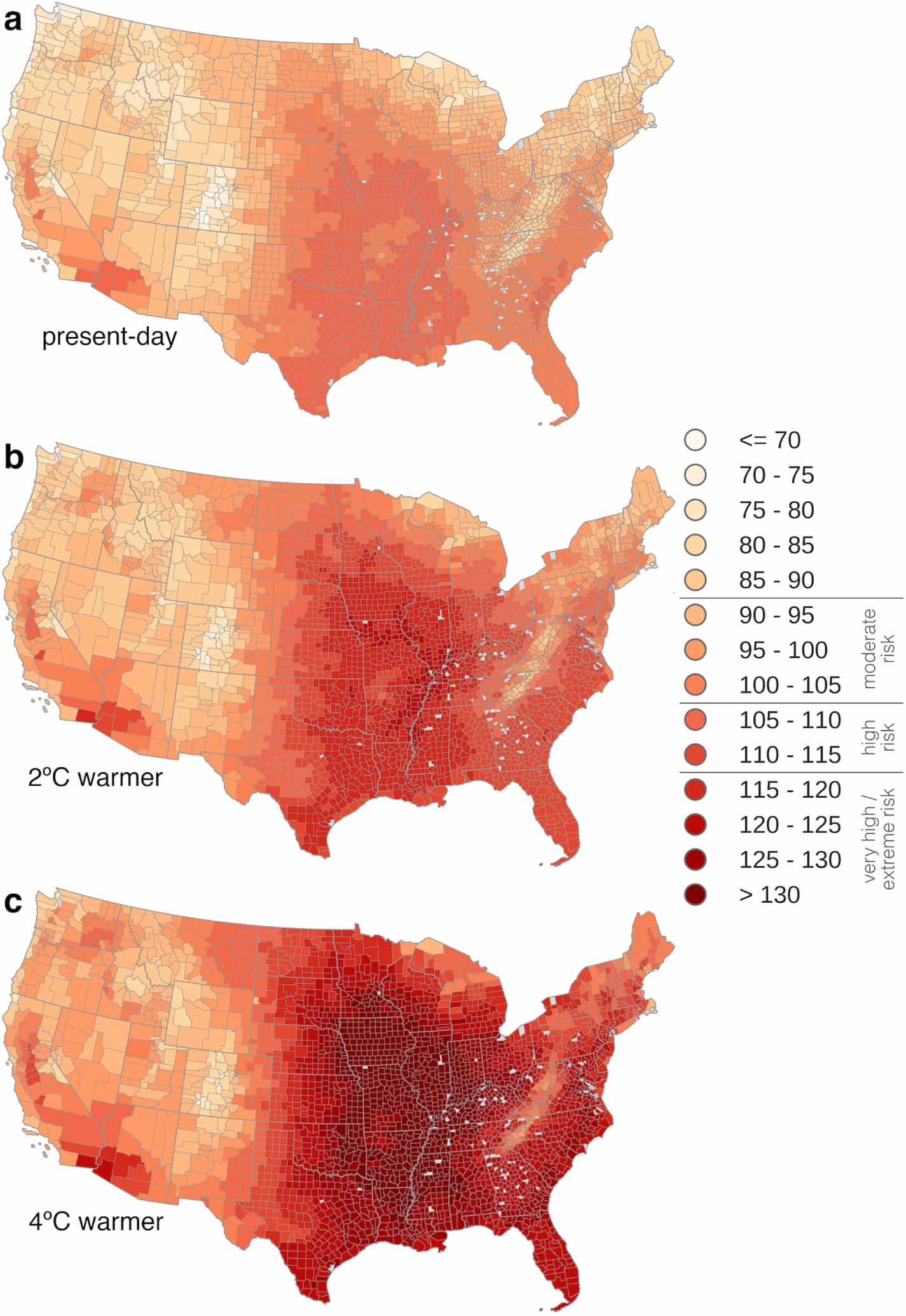 Figure 2. Present-day and projected Heat Index extremes. 95th-percentile of summertime (MJJAS) daily maximum Heat Index (°F) for (a) present-day observed (1979–2013), (b) projected with 2 °C of global annual mean warming, and (c) projected with 4 °C global annual mean warming (see Methods). Counties that contain no climate data grid centers are shown as missing values in gray. Color bar labels indicate the risk levels of the OSHA heat guidance for outdoor workers.