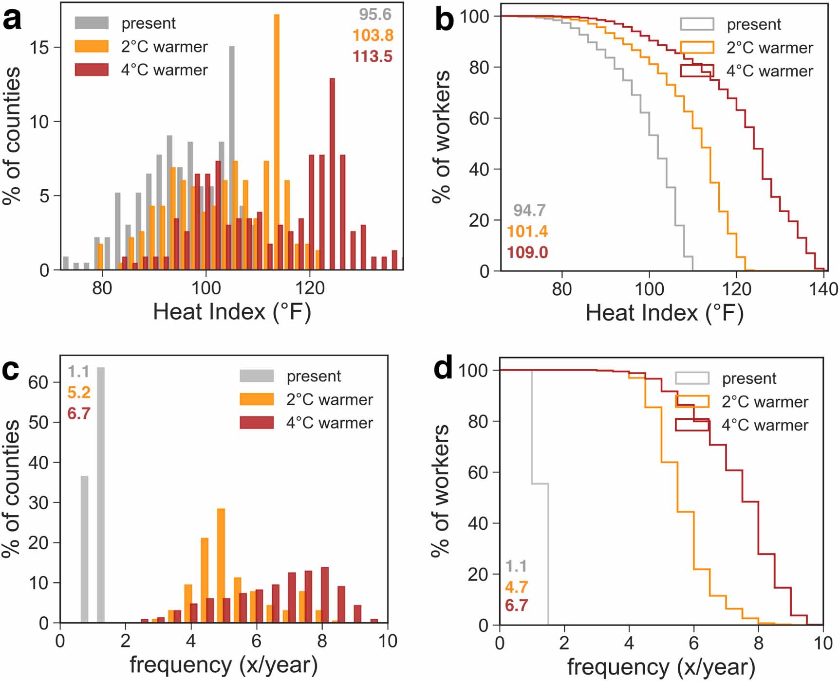 Standard image High-resolution imageFigure 3. County and worker exposure to extreme heat levels and heat waves. (a), (b) 95th-percentile of summertime (MJJAS) daily maximum Heat Index (°F) for present-day observed (gray), 2 °C of global annual mean warming (orange), and 4 °C of global annual mean warming (red) as (a) number of counties with ≥500 crop workers (%) and (b) cumulative number of workers (%); the percentage of (c) counties and (d) workers that experience a daily maximum HI for three or more days in a row that exceeds the present-day 95th-percentile level—colors and distributions the same as in (a), (b). The numbers in each corner indicate the county—(a), (c) and worker—(b), (d) weighted average.