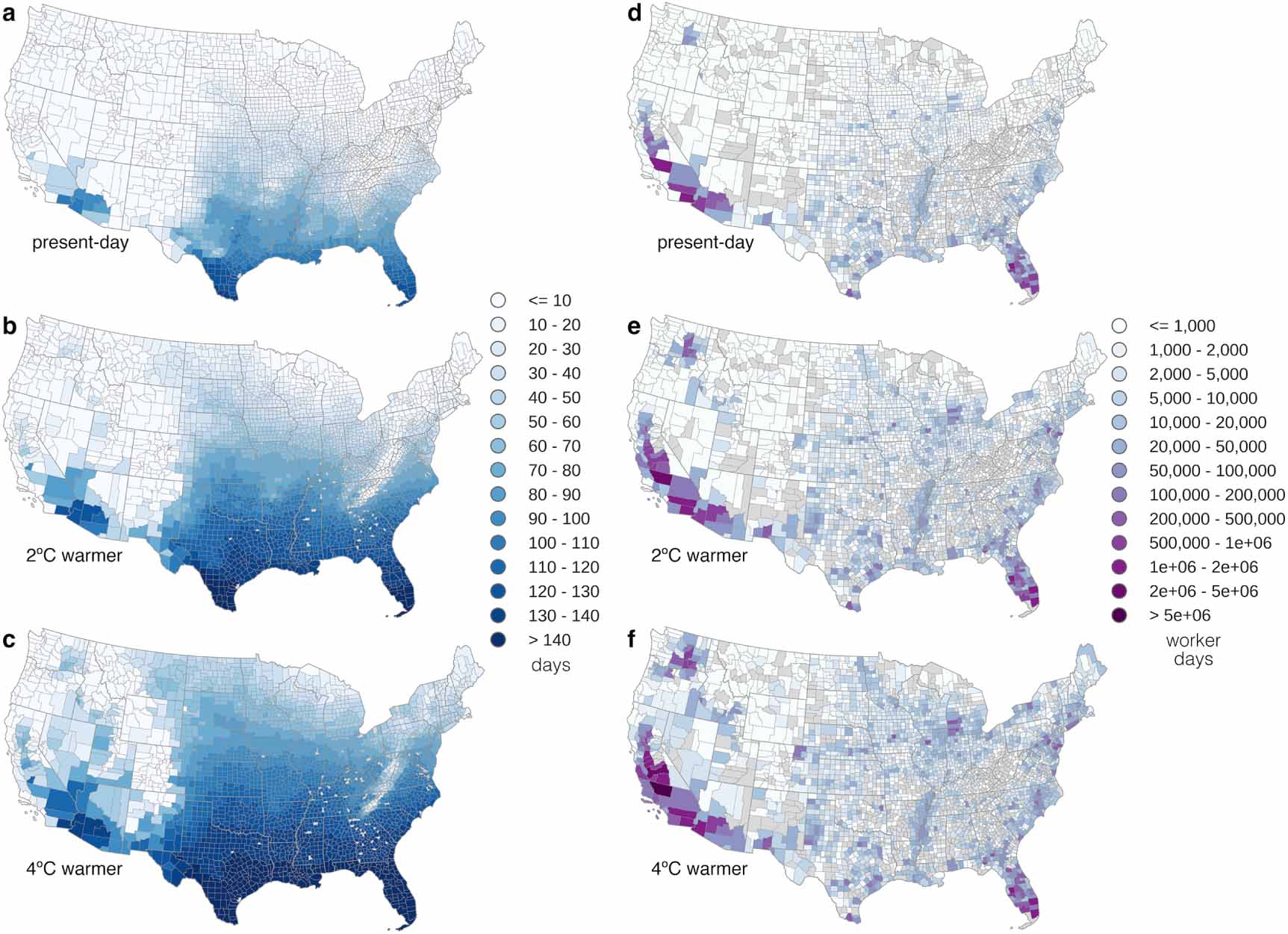 Figure 4. Present-day and projected worker exposure to unsafe heat levels. (a)–(c), number of days each summer (MJJAS) that the daily mean Heat Index exceeds the baseline Threshold Limit Value (83.4 °F; see Methods) for (a) present-day observed (1979–2013), (b) projected with 2 °C of global annual mean warming, and c projected with 4 °C global annual mean warming (see Methods); (d)–(f), as (a)–(c) but showing number of worker days, based on present-day crop worker employment levels (figure 1). Note the nonlinear color scale for the number of worker days. Counties with no employment data or that contain no climate data grid centers are shown as missing values in gray.