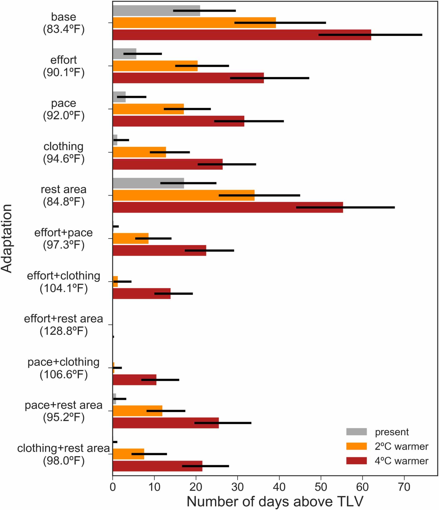 Standard image High-resolution imageFigure 5. Effect of on-farm adaptation measures on reducing heat risk. Median number of days per summer (MJJAS) that the average U.S. crop worker is exposed to a daily mean Heat Index higher than the TLV for their physical activity and clothing levels (values in parentheses; see Methods), for present-day observed (gray), 2 °C of global annual mean warming (orange), and 4 °C of global annual mean warming (red). The error bars indicate the 5th and 95th-percentile over the 35 years of observed and projected summers. The tested adaptation scenarios are: reduce effort (time worked/hour) from 90% to 50% (effort); reduce pace from moderate to light (pace); rest in AC instead of in the shade (rest area); wear single-layer instead of double-layer clothing (clothing); and combinations of these (see table 1). When three or more adaptations are combined, worker exposure becomes (nearly) zero across all scenarios, so these are not plotted here.