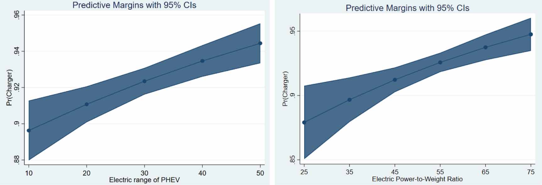 Vehicle attributes like electric range and power-to-weight ratio have a small but significant positive marginal effect on the probability of being a charger. All else constant, a unit increase in the electric range or the power-to-weight ratio reduces the probability of being a non-charger on average by 0.1 percentage points. Figures 2(a) and (b) show the marginal effect of electric range and the electric power-to-weight ratio on the predicted probability of being a charger for different levels of electric range and power-to-weight ratios. We observe that the marginal effect of a unit increase in the electric range of PHEV increases as the range of the vehicle goes up. A similar result is observed in relation to the power-to-weight ratio. The increase in marginal utility and thereby the probability of charging due to more enhanced electric driving experience gets stronger with increases in power-to-weight ratio.