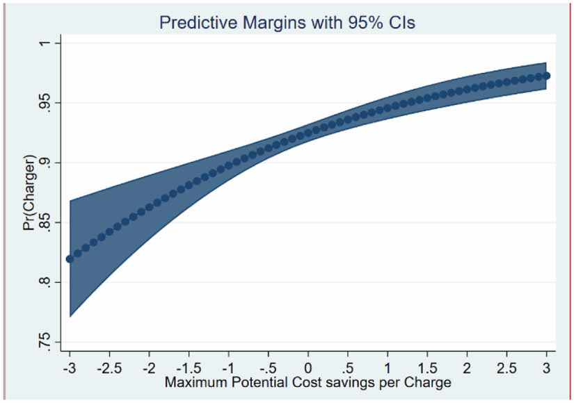 Standard image High-resolution imageOwnership of solar cells at home has a significant positive marginal effect on being a charger. As in the case of electricity price, the result should be interpreted with caution as there could be a self-selection bias whereby PHEV owners who want to maximize electric miles (perhaps due to environmental concern or the desire to save on fuel costs) are more likely to install solar cells at home due to the same environmental concern or desire to reduce electricity bills. The dwelling type also has a strong impact on the probability of being a non-charger. Compared to PHEV owners living in detached homes, condominium dwellers are on average 4 percentage more likely while apartment dwellers are 19 percentage points more likely to be non-chargers. Free workplace charging has a positive marginal effect on the probability of being a 'charger' (3.6% more likely). The sign of the marginal effect of demographic characteristics, attitude towards incentives like the HOV lane access, and vehicle age concurs with the odds ratio estimates and explanations mentioned earlier. Finally, everything else constant, a unit increase in potential cost savings raises the probability of being a charger on an average by 2.4 percentage points (table 5). Figure 4 shows the marginal effect of potential cost savings on plug-in behavior.