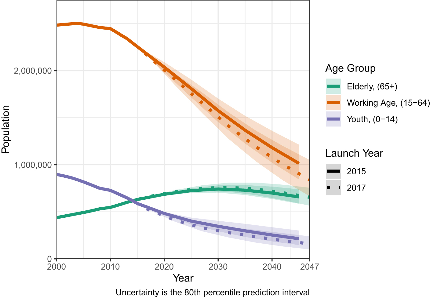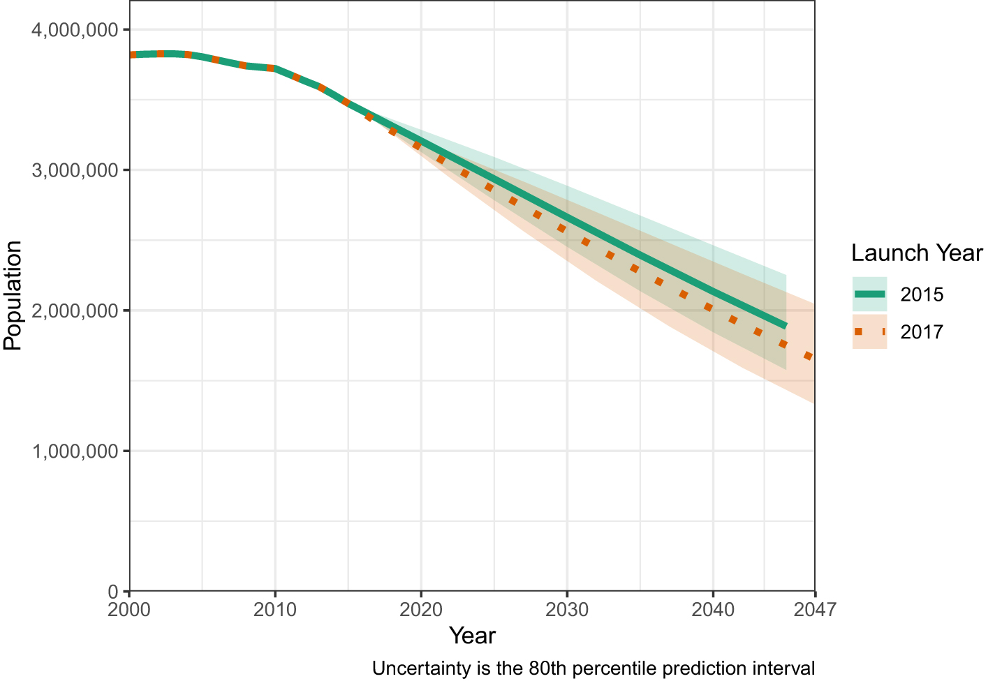 Figure 1. Projections of Puerto Rico's population (2017–2047). These compare Puerto Rico's projected population if projected prior to the hurricanes (2015) and after the hurricanes (2017). The uncertainty is the 80% prediction interval.