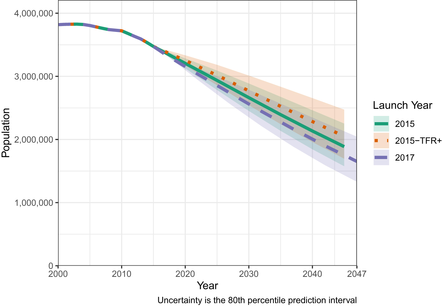 Figure 3. Projected population total for Puerto Rico, 2017–2047. Projections of Puerto Rico's population launched in 2015 and 2017. These compare Puerto Rico's projected population if projected prior to the hurricanes (2015 in red), after the hurricanes (2017 in blue), and prior to the hurricane but with a 31% increase in fertility rates (green). The uncertainty is the 80% prediction interval.